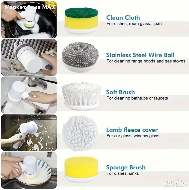 С 5 сменяеми глави е идеална за вани, плочки, подове, печки, стъкло и мивки.