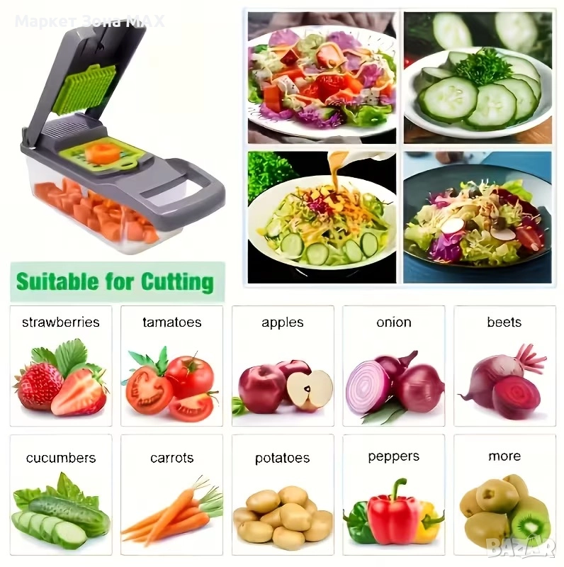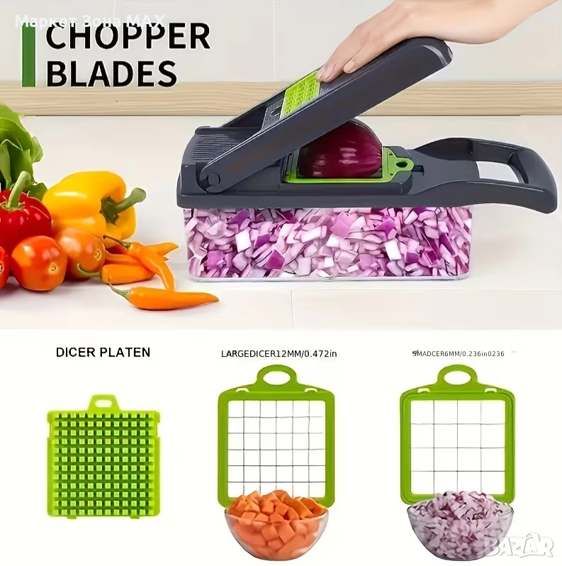 Изключително прецизен 16-в-1 кухненски чопър за бързо и лесно рязане, настъргване и наситняване на зеленчуци.