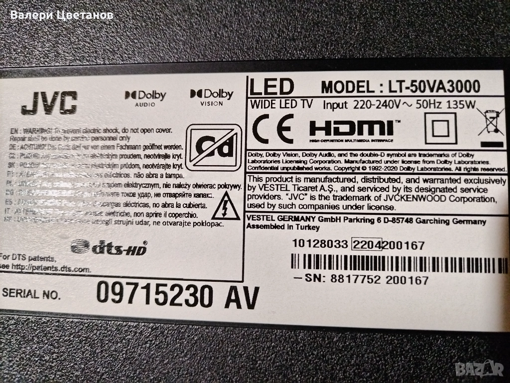 JVC LT-50VA3000 части 17MB170 ,17IPS72 ,JL.D500C1330-078KS-M_V01 ,TCon CCPD-TC495-008V4.0 ,дистанцио → Обява 52891592
