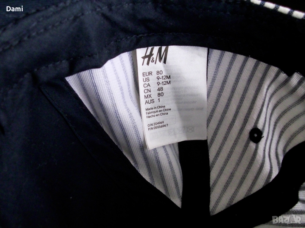 Детска шапка Н&М с извита козирка EUR №80 за 9-12- месечно бебе. Бродирана памучна декорация. Вентилационни отвори. На тила има регулация с широк ластик. Дължина на вътрешното коланче 50 см, с разтеглен ластик 52 см.