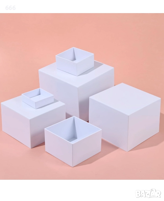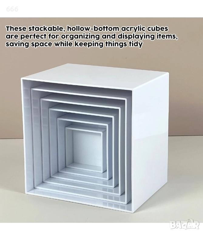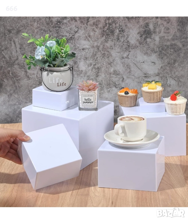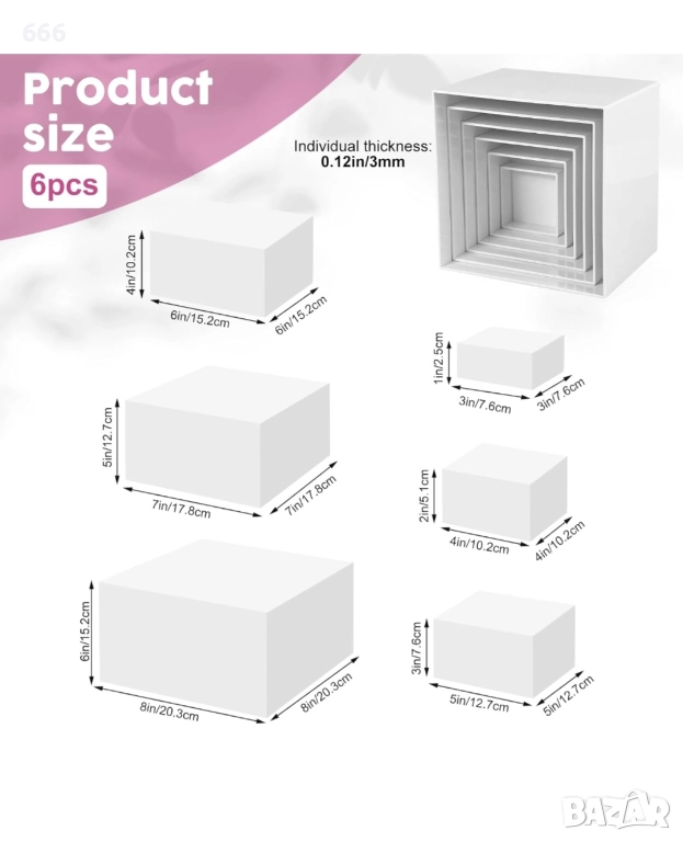Този комплект от 6 бели акрилни поставки е идеален за представяне на десерти, хранителни продукти, бижута или фигурки на всяко събитие. Различните размери (7,62x7,62x2,54 см - 10,16x10,16x5,08 см - 12,7x12,7x7,62 см - 15,24x15,24x10,16 см - 17,78x17,78x12,7 см - 20,32x20,32x15,24 см) осигуряват динамични опции за излагане на бюфети, кетъринг събития и специални поводи.