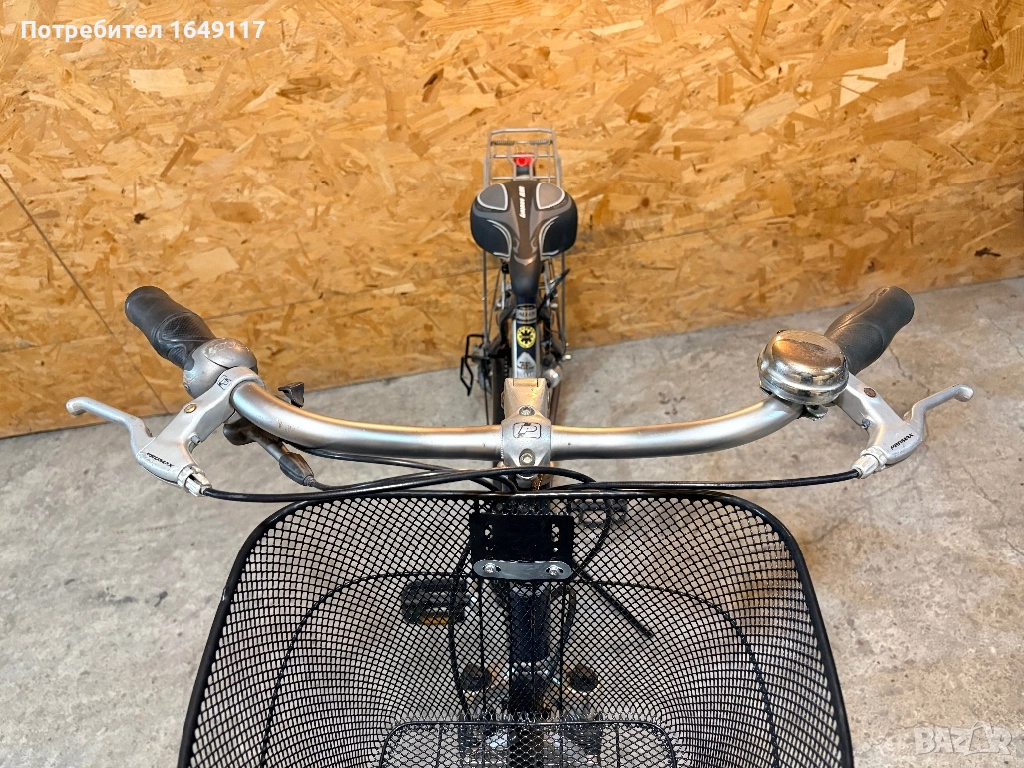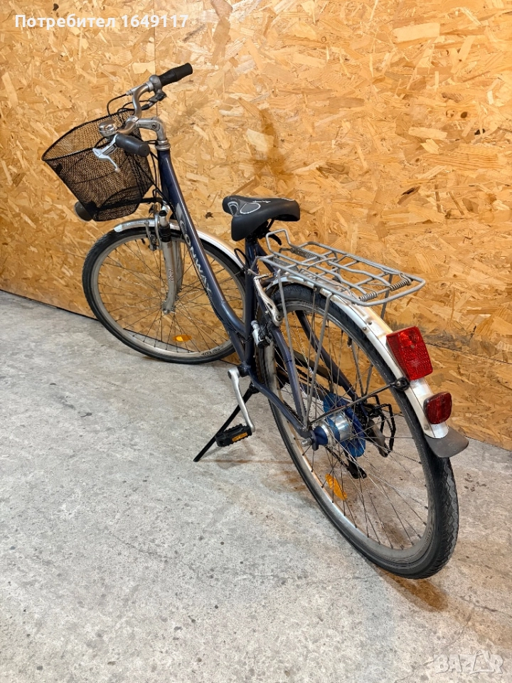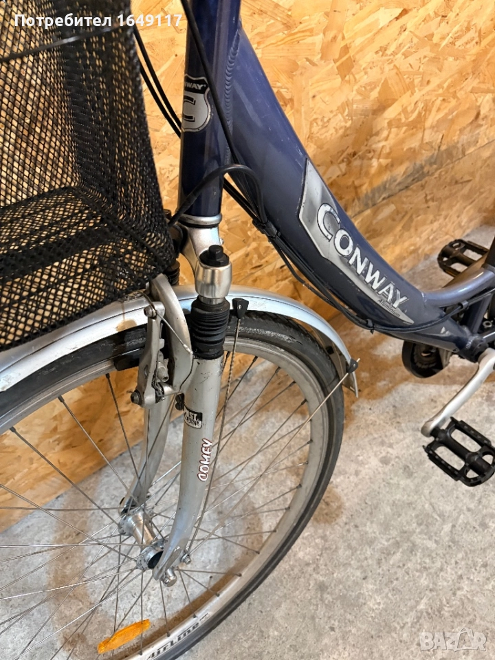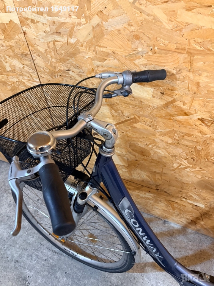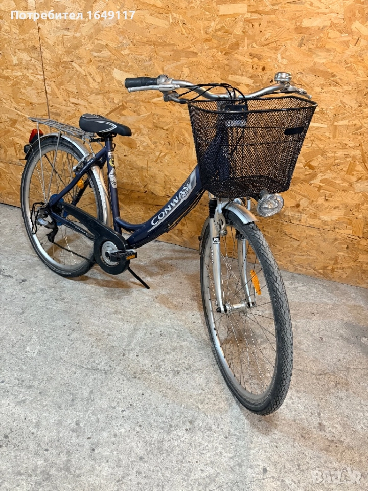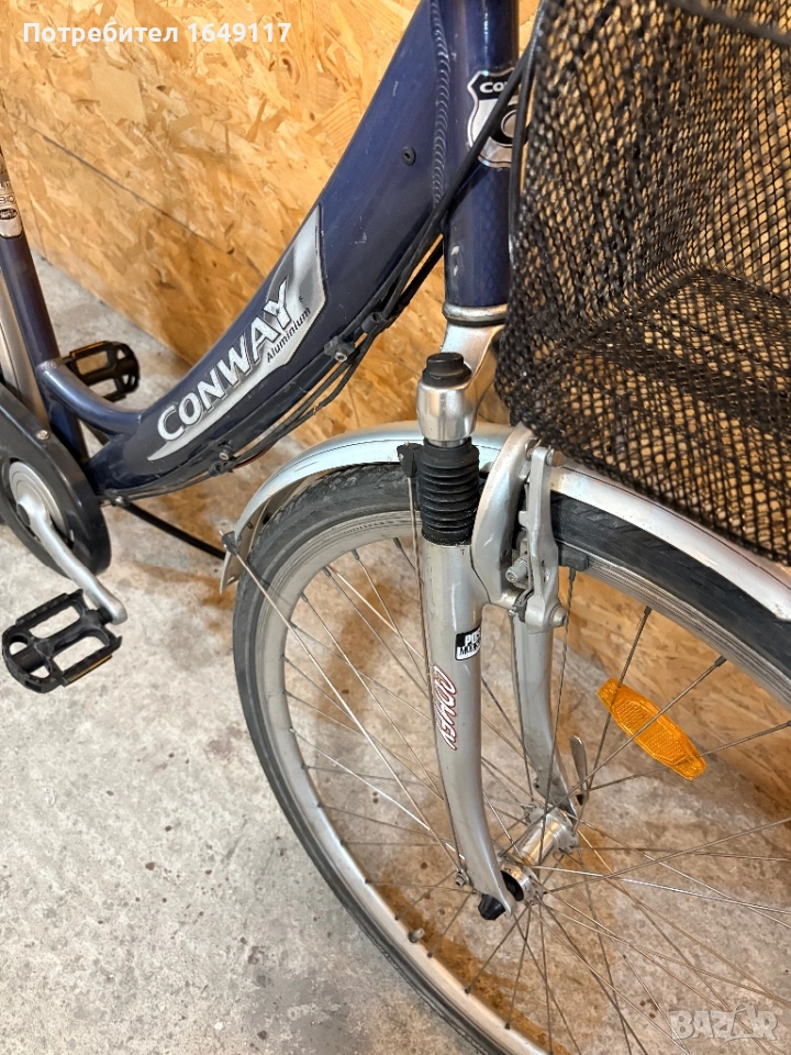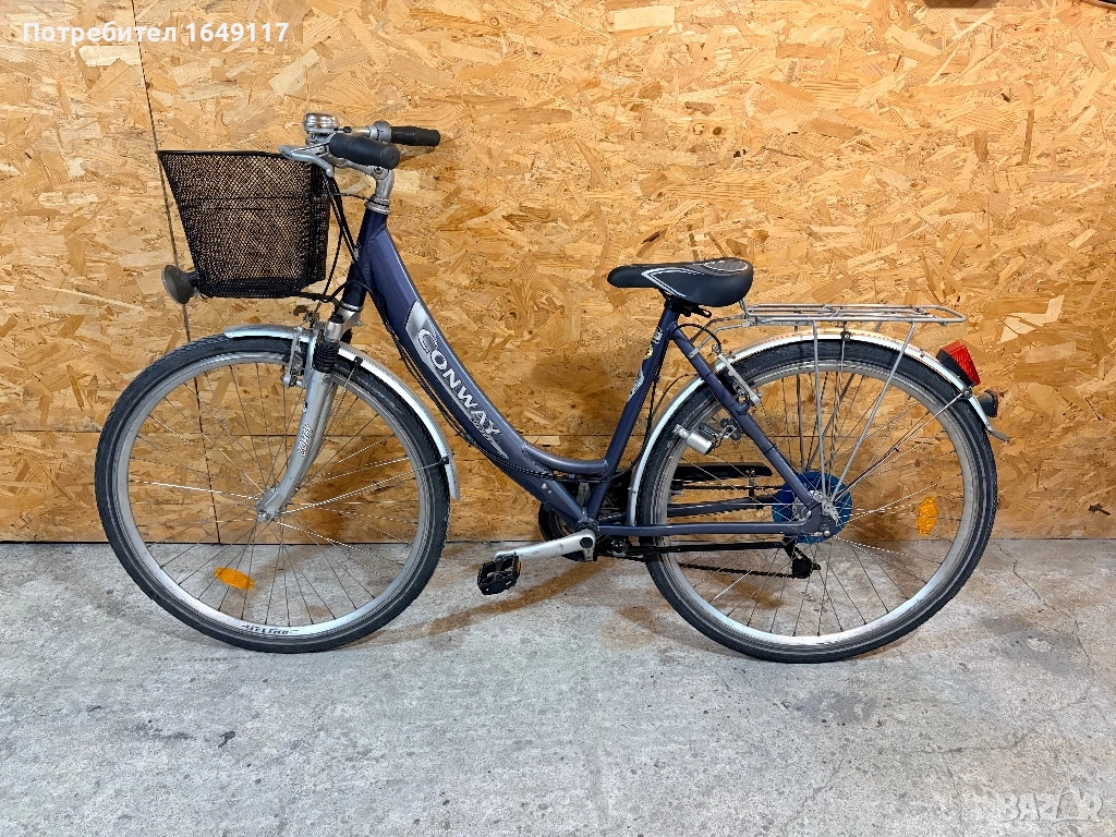 Продавам 28цола, съвсем малко употребяван, дамски-градски велосипед Conway Aluminium by Hartje[made in Germany]. Олекотена, алуминиева рамка - 50см. Вътрешни скорости SRAM Dual Drive - 24бр. c revo shift командa SRAM. Алуминиеви курбели. Предна амортисьорна вилка Post Moderne Comfy. Спортна ергономична седалка. Алуминиеви, двойностенни-аеро капли, и гуми с усилен градски профил. Предна и задна алуминиеви V-break спирачки Promax. Широко градско кормило с алуминиева раздвижна лапа Promax. Заден багажник с натоварване до 25кг + кошница за багаж отпред. Олекотени пластмасови калници, алуминиева стойка, динамо с халогенен фар и габаритна светлина, светлоотразители, звънец.