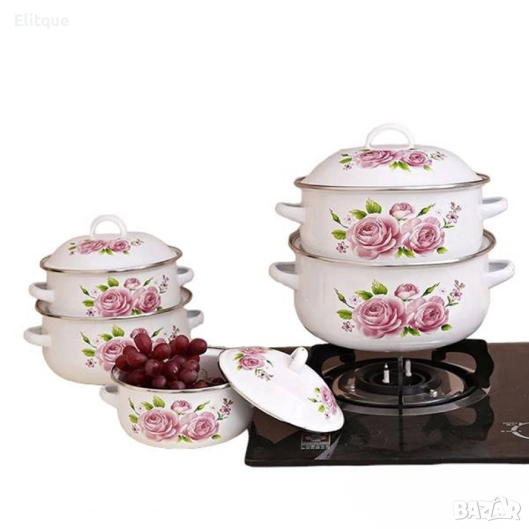 Емайлирани тенджери 5 бр. с незалепващо покритие и с емайлирани капаци. Подходящи за приготвяне на различни ястия, осигурявайки равномерно загряване. Съдовете са с качествено емайл покритие, могат да се използват върху керамични и др. готварски плотове, подходящи и за електрически и газови печки. Не са съвместими с индукционни котлони. Съдовете са лесни за почистване, може да се поставят и в миялна машина. Размери: 18, 20, 22, 24, 26 см. Материал: Емайл.