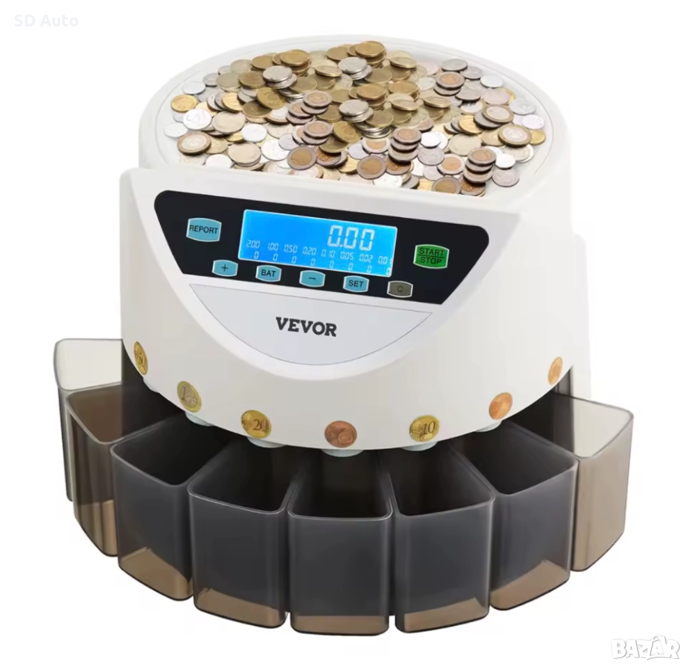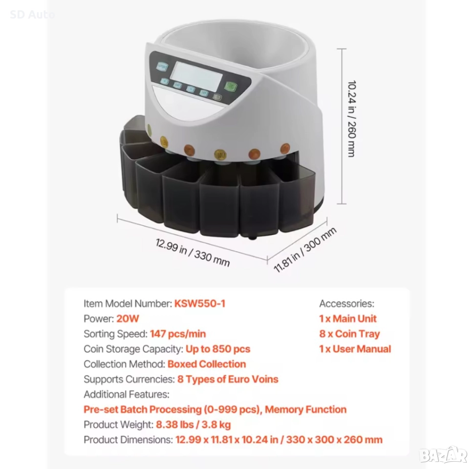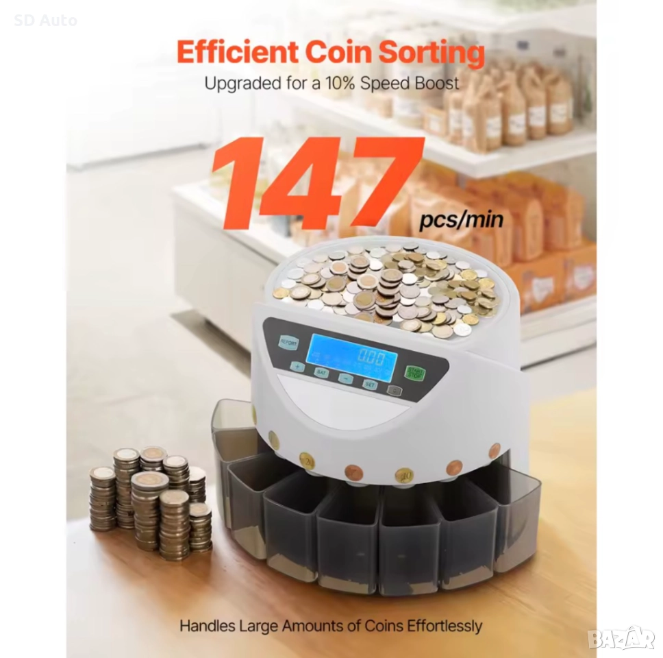***Монетният брояч с голям капацитет побира до 850 монети. Това ви позволява непрекъснато да броите повече монети, без да се налага често да сменяте ролките с монети.Сортировчикът на монети може бързо да сортира до 147 броя в минута, като по този начин подобрява скоростта на сортиране с 10% в сравнение с конвенционалните методи.LED екранът ясно показва общата сума и броя на монетите, което ви позволява лесно да следите напредъка на сортирането на монетите. Това опростява създаването и управлението на статистика.
