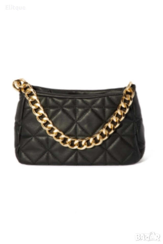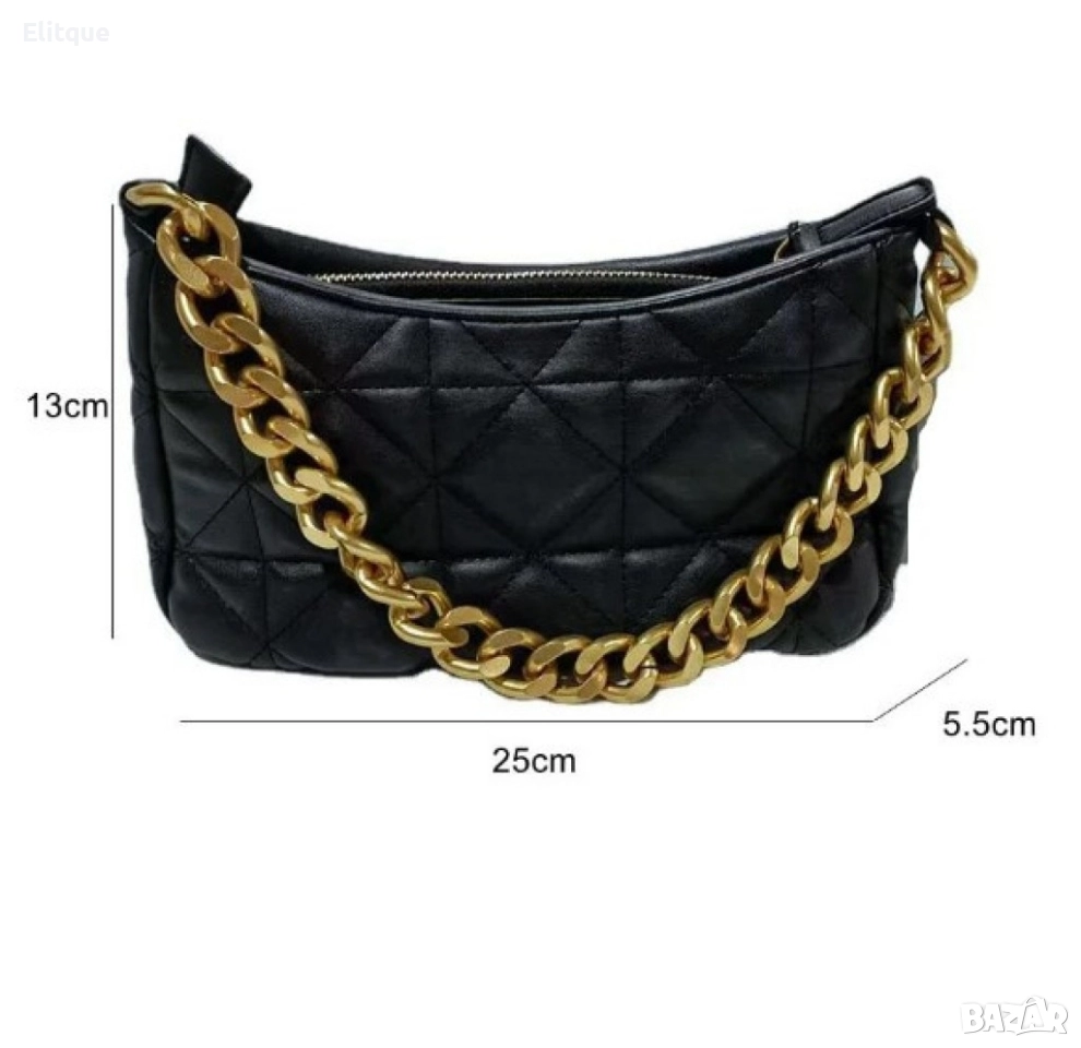 Тази стилна черна ватирана чанта е изискан аксесоар, който ще добави елегантност на вашия облик. Изработена в черен цвят, тя е изключително универсална и подходяща за различни събития и стилове. Дългата златиста дръжка тип едър синджир придава на чантата изключителен шик и стил, като я прави подходяща както за ежедневието, така и за по-официални събития. Златистият акцент добавя луксозно усещане към визията на чантата, като я прави изключително модерна.