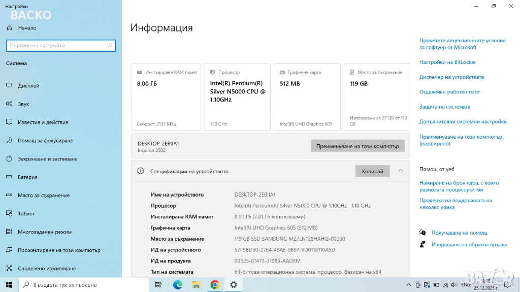 Хард диск: 128Gb SSD. Прясно инсталиран лицензиран windows 10home интегриран в дъното (активира се автоматично след включване в мрежата). Възможност за абгрейд до windows 11.