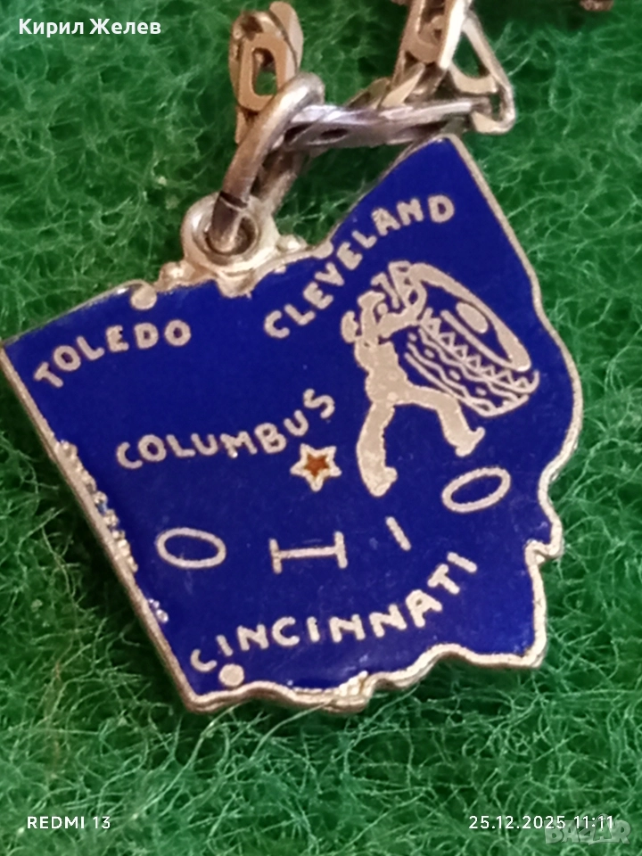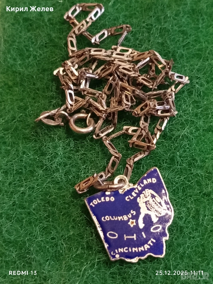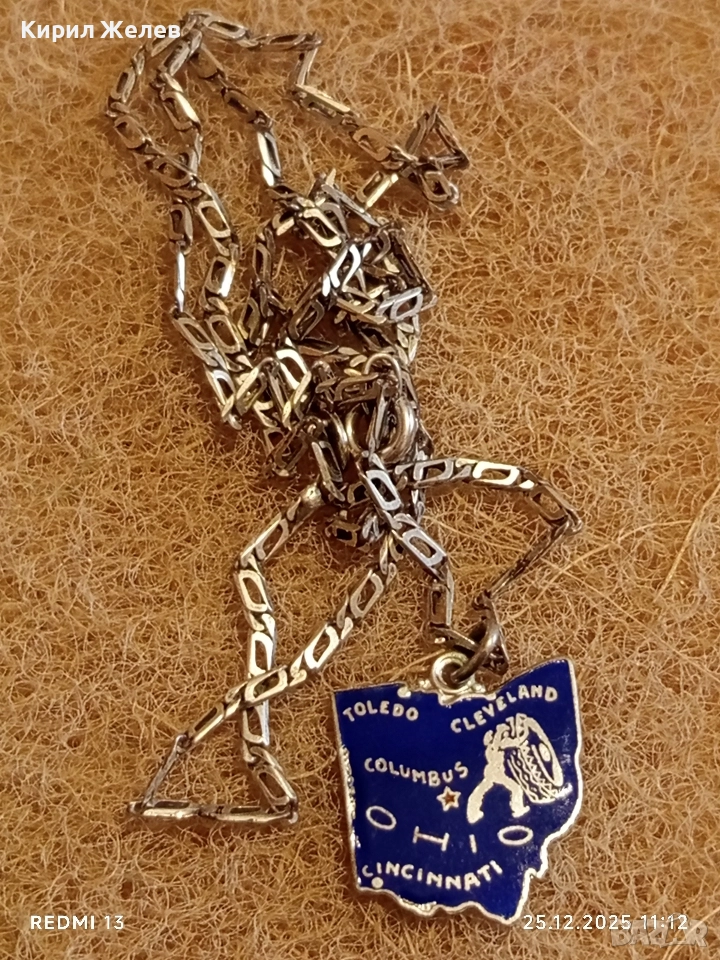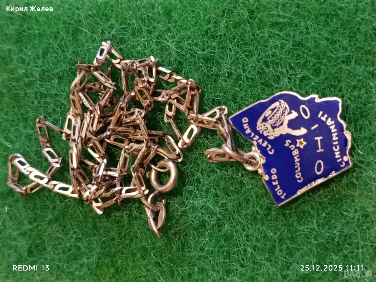 Винтидж сребърен емайлиран талисман на щата Охайо САЩ с сребърен синджир 37543