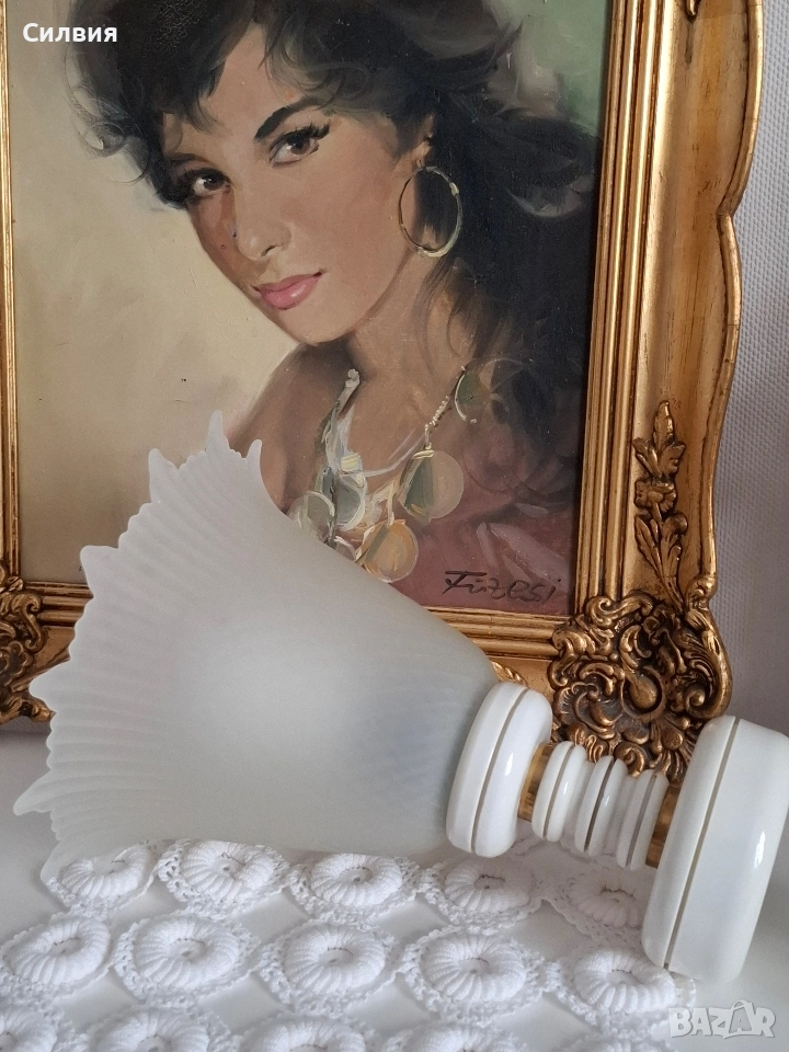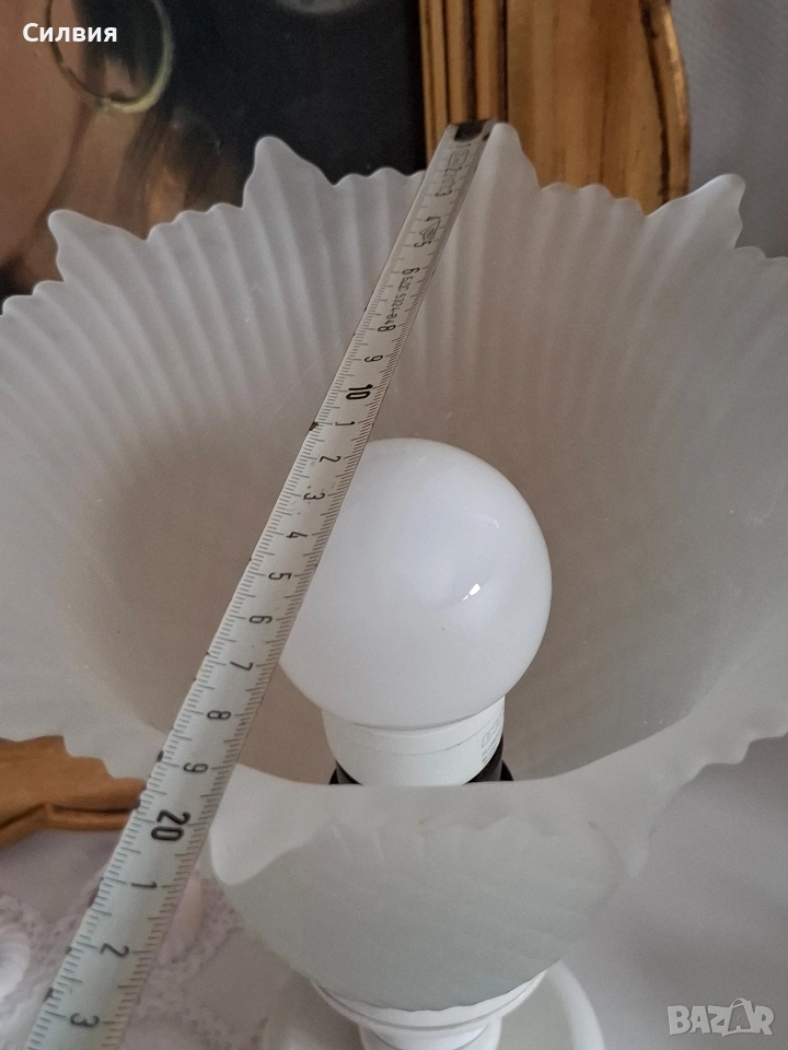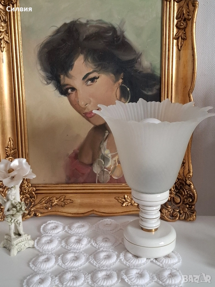 ретро стил. Матиран стъклен абажур с вълнообразен ръб и орнаментирана основа в бяло със златен кант. Подходяща е както за класически, така и за винтидж интериор. Деликатната светлина, която излъчва, създава уютна и спокойна атмосфера – идеална за спалня, всекидневна или коридор. Винтидж ~60/70-те години. Височина: около 27 см. Материали: стъкло и керамика/порцелан Цвят: матирано бяло. С включен кабел и работещ ключ за включване/изключване. Състояние: Отлично, без забележки за годините си.🙂 ೋ🌷 ೋ🌷 ೋ🌷