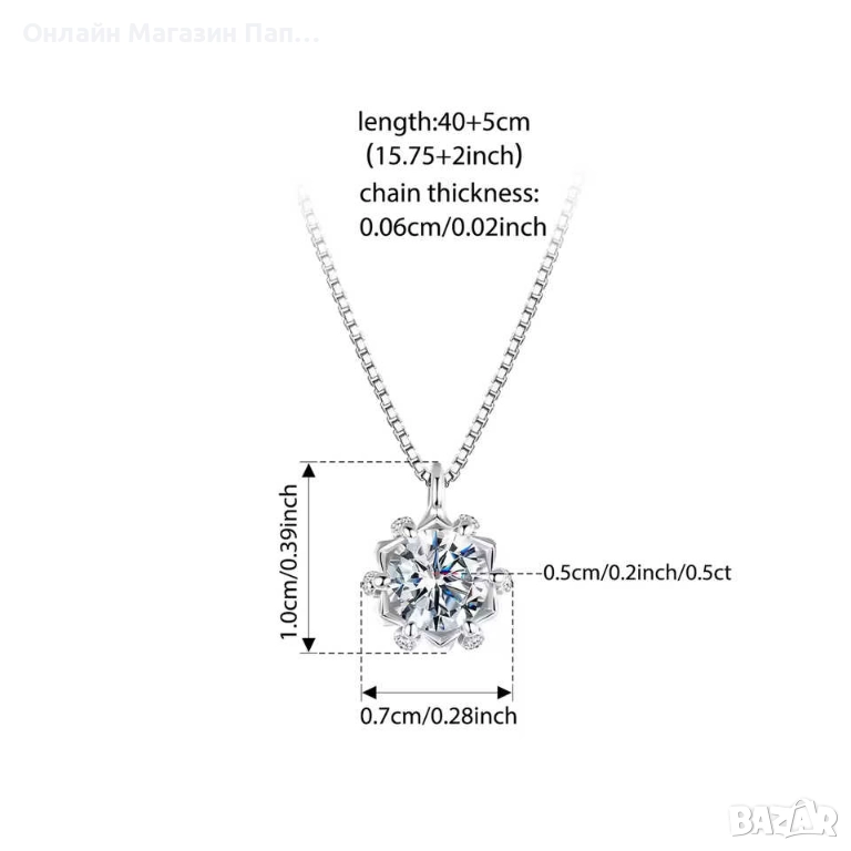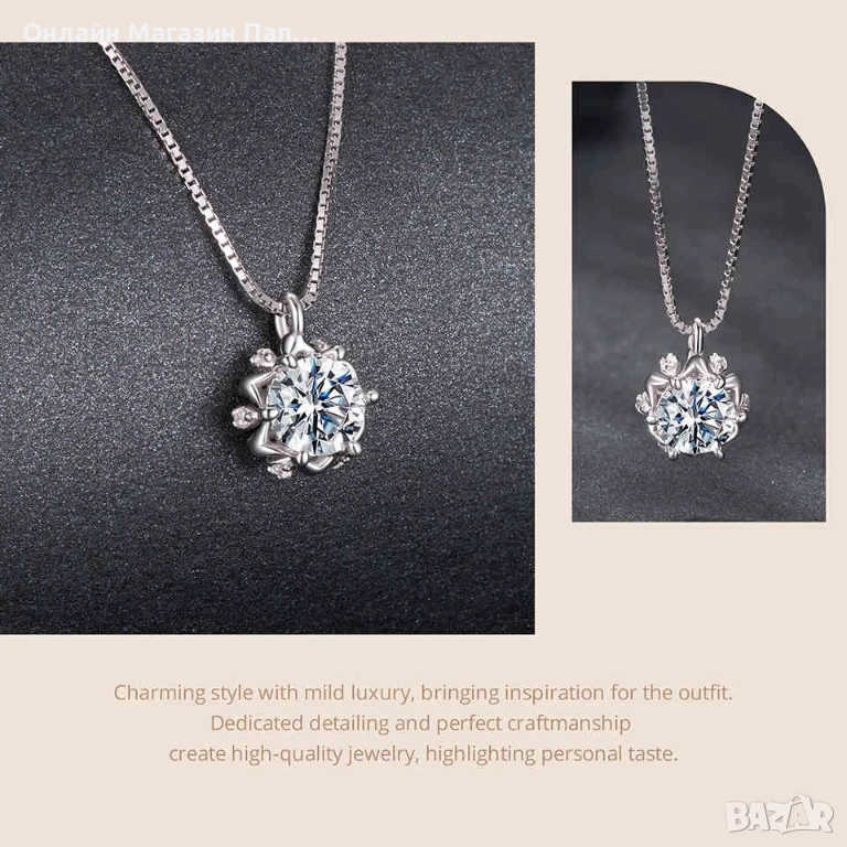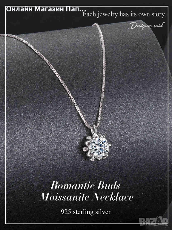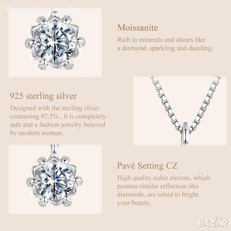 Основният диамант мойсанит (D-цвят, VVS1) впечатлява с изключителна чистота и искра, сравнима с естествен диамант. Дизайнът е допълнен с малки циркони, които придават допълнителен блясък и елегантност.