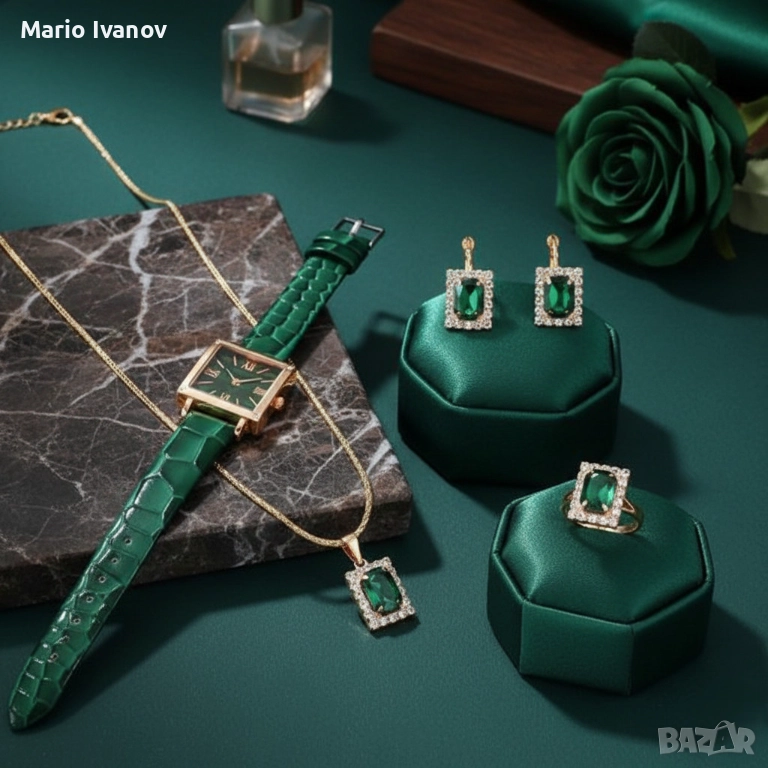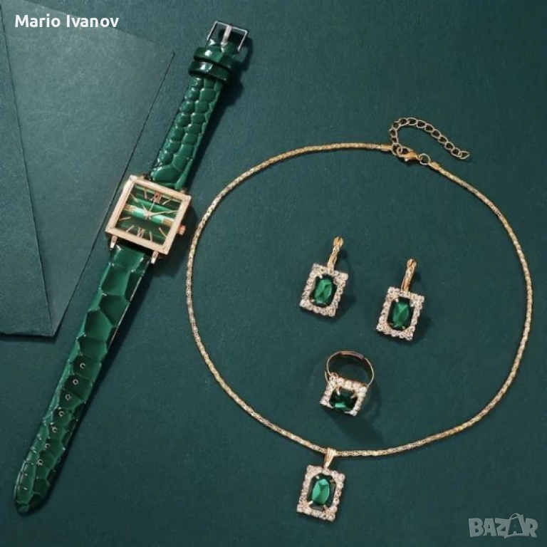 Елегантен комплект часовник и бижута с зелени кристали и златист корпус → Обява 52896388