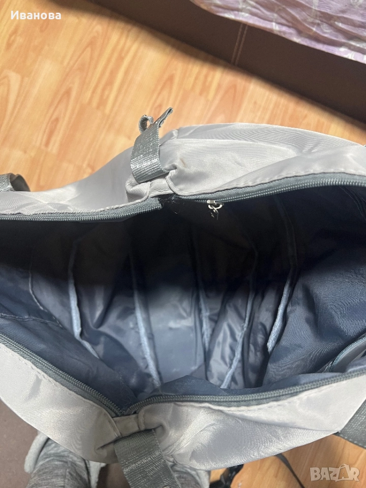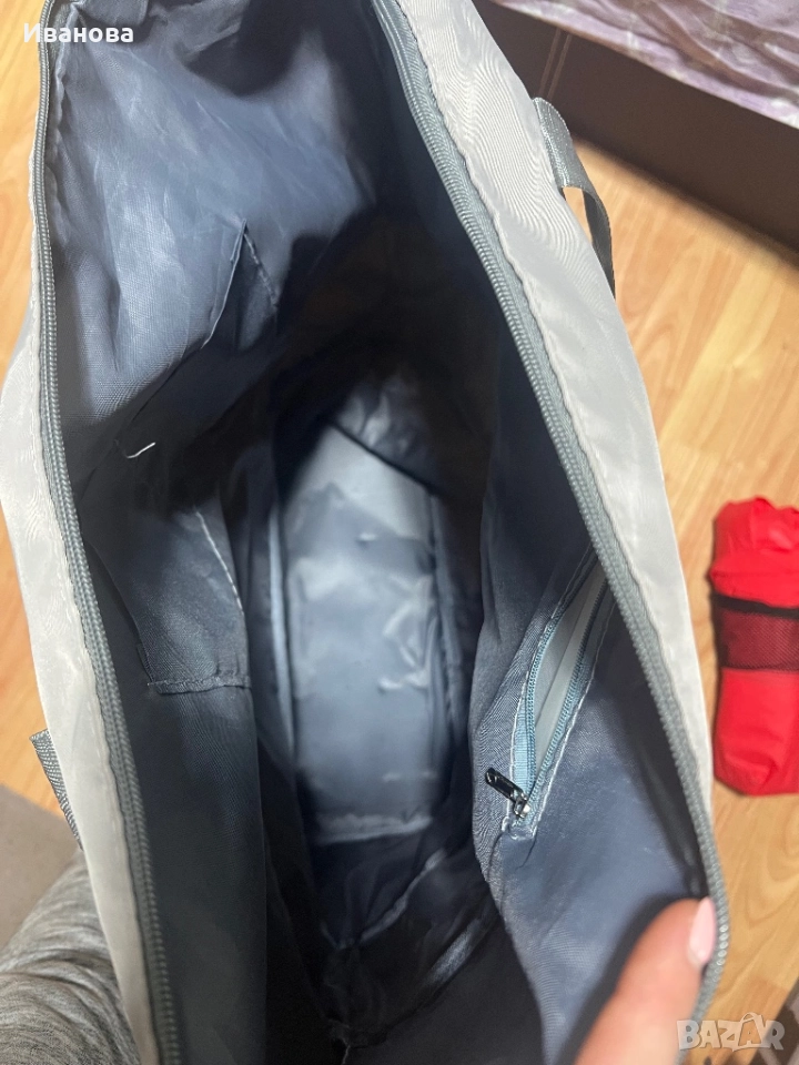 Сак на колелца, колелцата се свалят, с твърдо дъно е и има 3 нива. Има странична зашивка за закрепяне към дръжка на куфар.