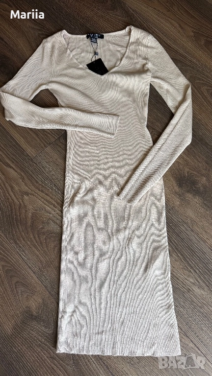 Елегантна силуетна рокля в бежов цвят, която подчертава фигурата.