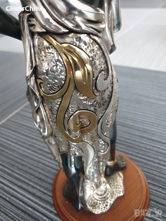 Височина 39 см, дървена основа 13 см, плътна/тежка (1-2 кг), изключително детайлна, стара (Италия Венеция 1980-те), рядка, изцяло ръчно оцветяване/декориране с 22К злато и сребро проба 925 (Sterling Silver, на марката CIARTE), с маркираовка/сребърен етикет (показан).