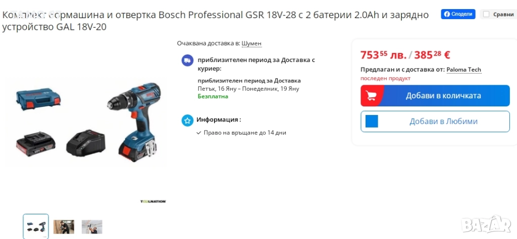 Продавам лек и компактен акумулаторен винтоверт на Бош като нов, както се вижда на снимките и работи перфектно без никакви проблеми, оригинално малайзийско производство внос от Франция. Обявената цена включва машината, 2 батерии, зарядно устройство и L-boxx куфар. Може и без куфара за 130евро. Пращаме с опция преглед и тест с куриерска фирма еконт може и лично предаване за гр. Шумен. Магазинската цена на комплекта е: 385евро