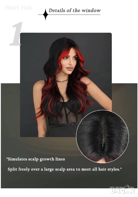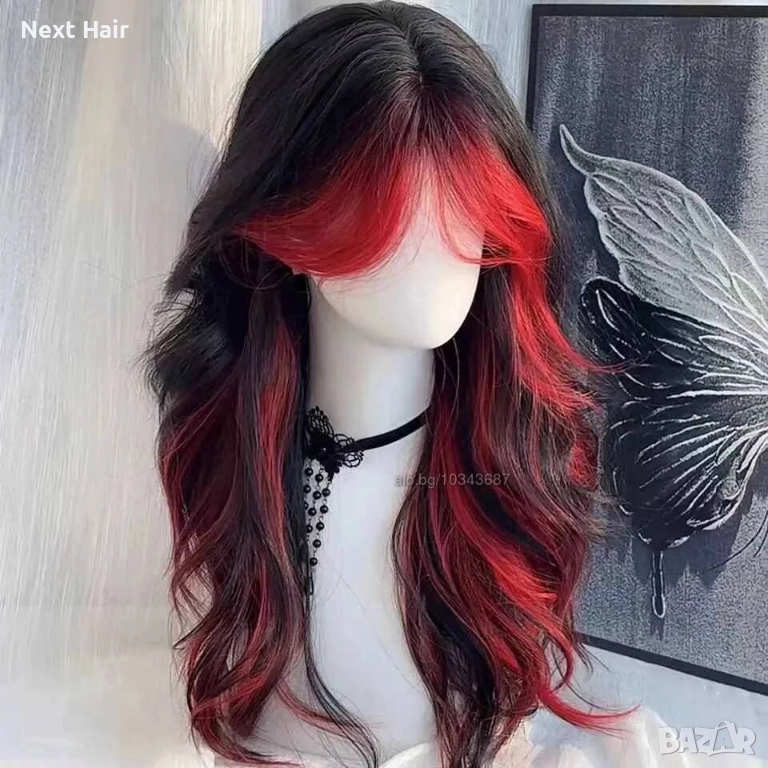 Ефектна омбре черна перука с червени кичури и краища → Обява 52897647