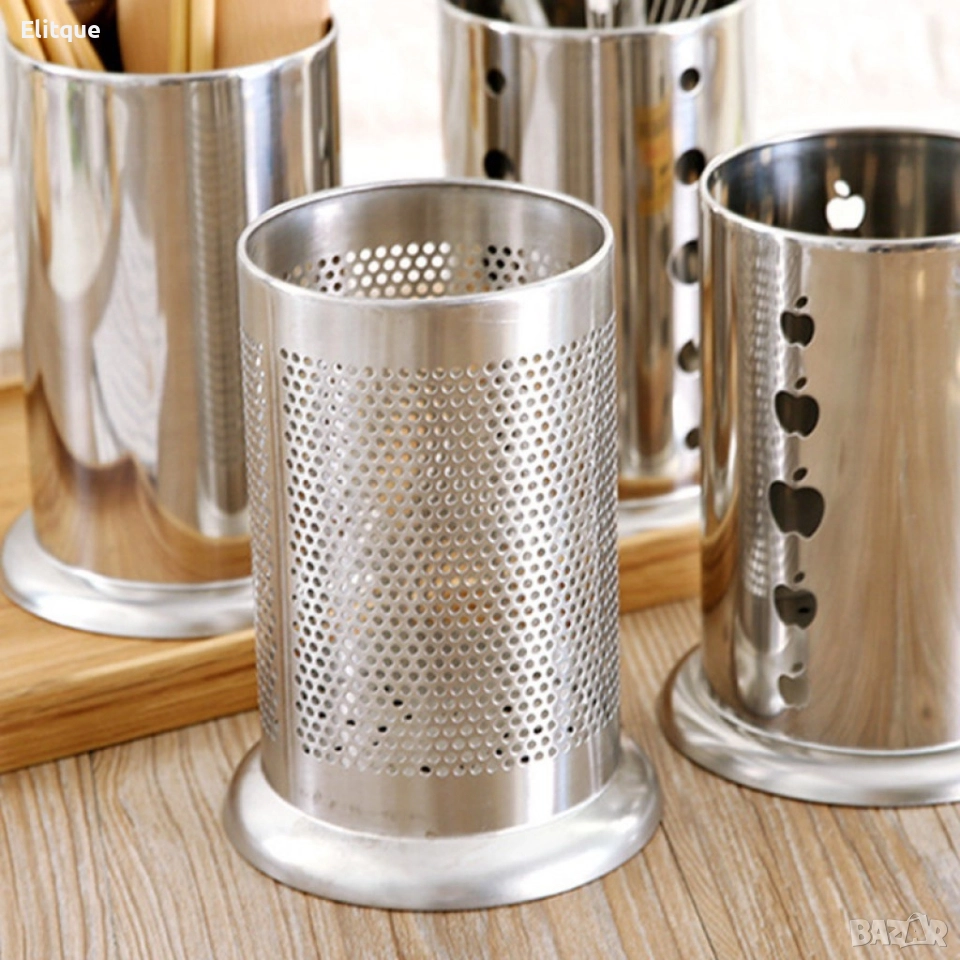 Металният органайзер за прибори в размери 12.5 x 12.5 x 17см е компактен и функционален. ? Той предлага изобилие от пространство за съхранение на вашите кухненски инструменти, като същевременно запазва наредеността във вашия кухненски плот. ? Неговата здрава метална конструкция гарантира дълготрайност и устойчивост на тежките кухненски прибори, като същевременно добавя стил и организация във вашия интериор. ?