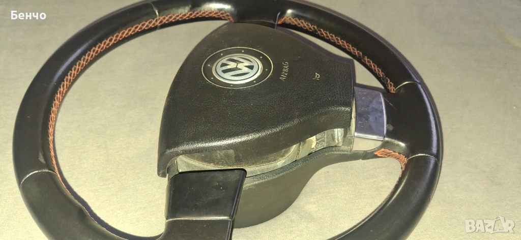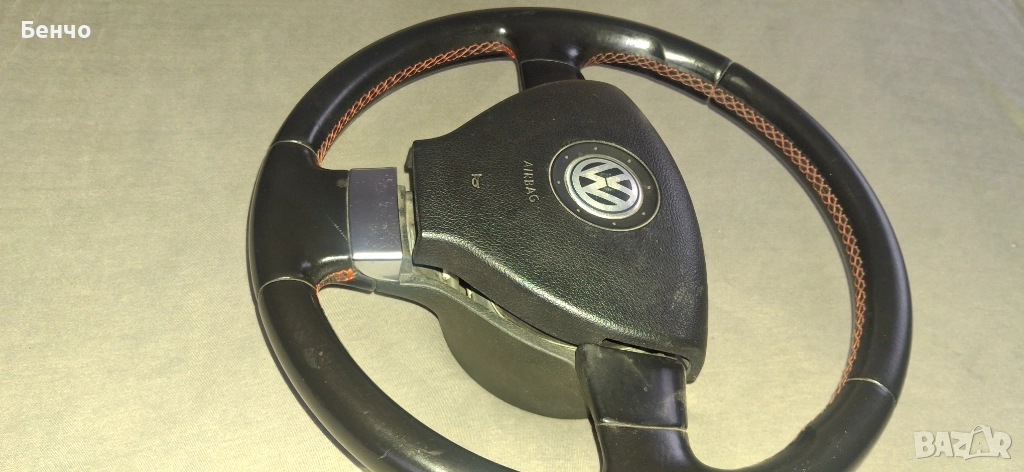 Продавам оригинален трилъчев волан с естествена кожа, шев с червен конец. Продава се комплект с аербег.