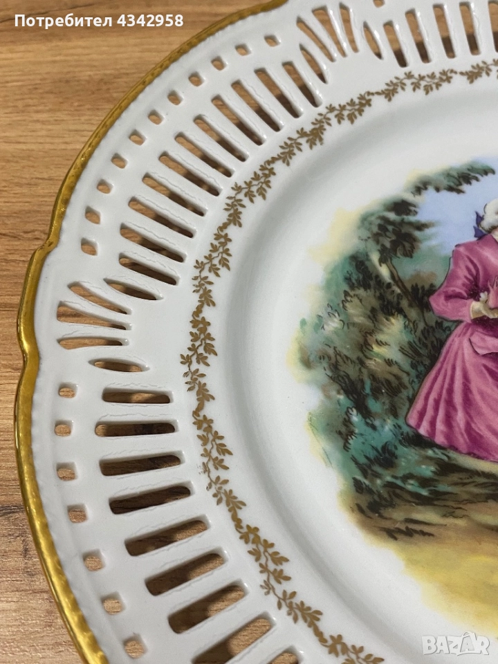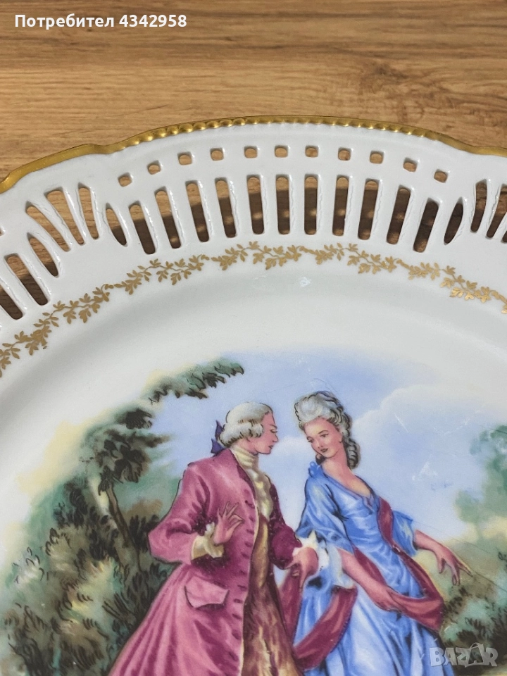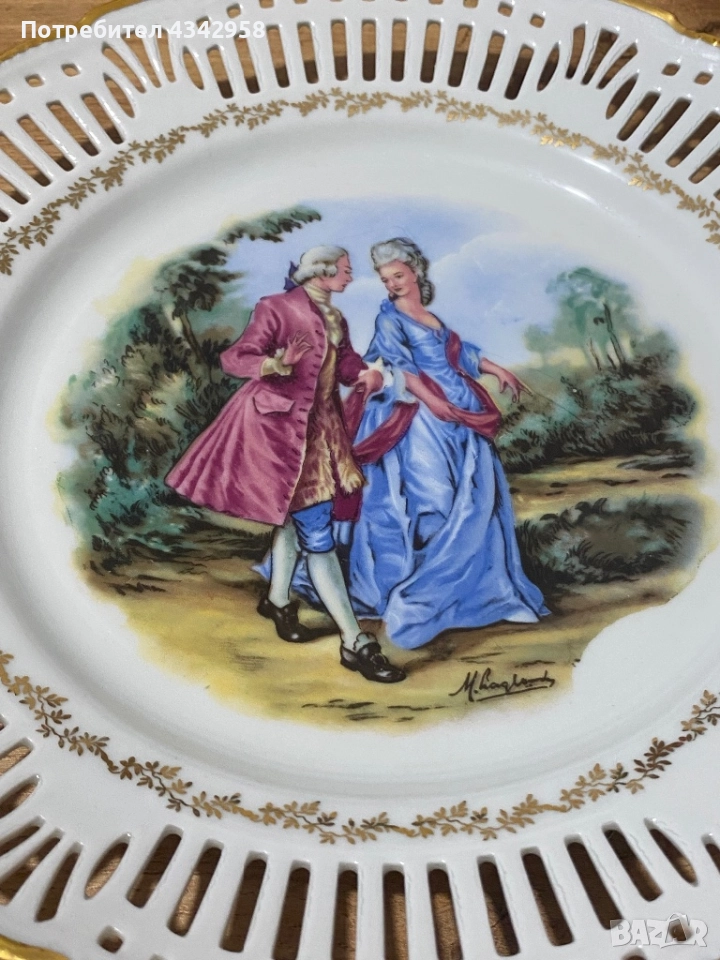 Чинията е с изключително красив ажурен борд, богата златна позлата и централна галантна сцена в стил рококо (XVIII век). Фин немски порцелан, произведен за декоративна и представителна употреба.