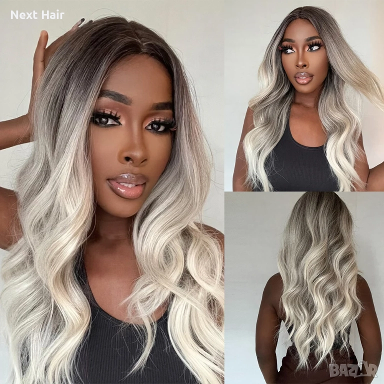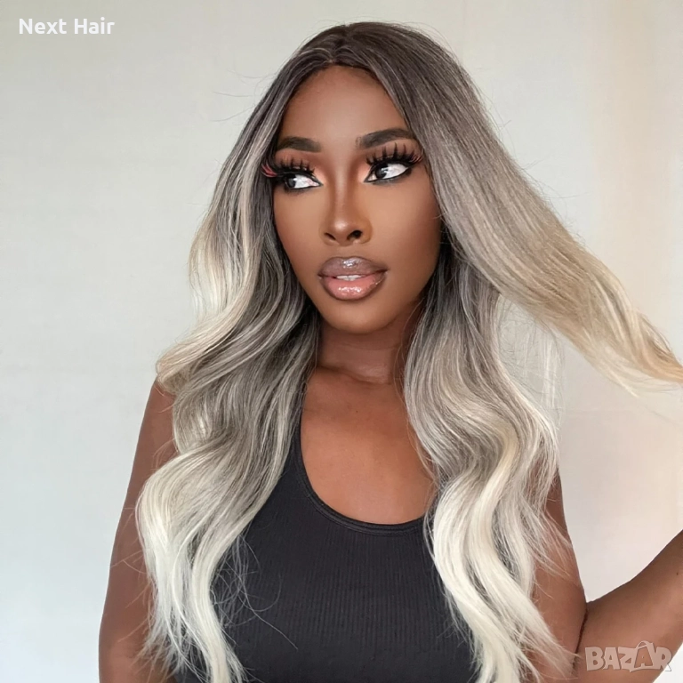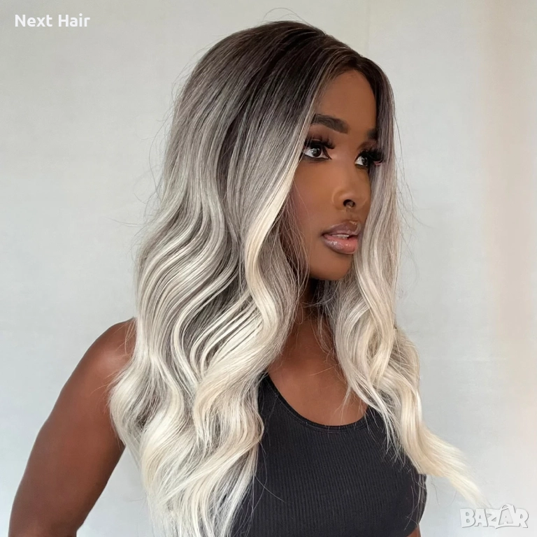 Омбре перука със средна дължина — тъмни корени и пепеляво светлоруси краища, чуплива текстура → Обява 52897865