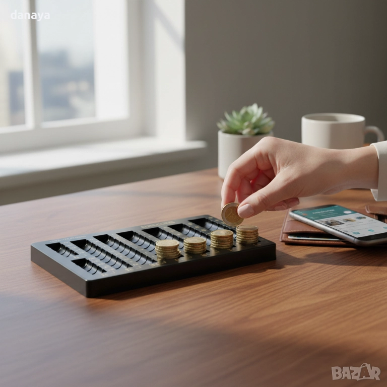 Органайзер монетник за евро монети. Табло за сортиране и броене на евро монети, създадено за бърза, точна и удобна работа с ресто в евро. Практичен монетник за евро монети, който позволява ясно разпределение на всички номинали – от 1 цент до 2 евро, като улеснява ежедневната работа в магазини, заведения, офиси и търговски обекти.