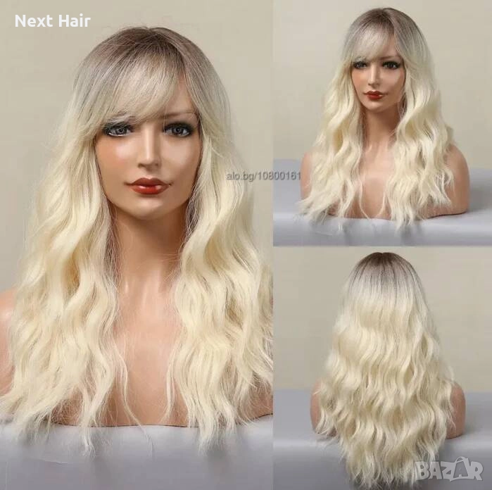 Светло руса омбре чуплива перука 60 см с тъмни корени и бретон → Обява 52897976