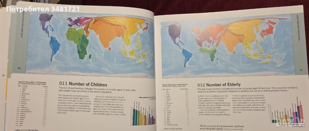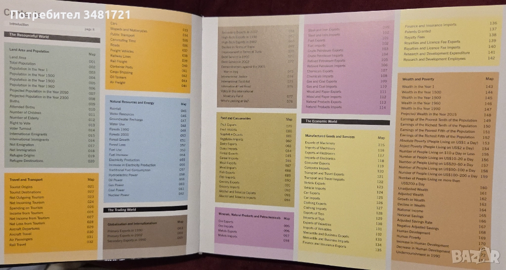 Една много богата колекция от карти и статистика, описваща огромен набор от елементи от живота на хората по света. От ресурси, популация и животински свят, през транспорт, туризъм и търговия, до икономика, консумация, гласуване, болести, религия и цени на жилищата.