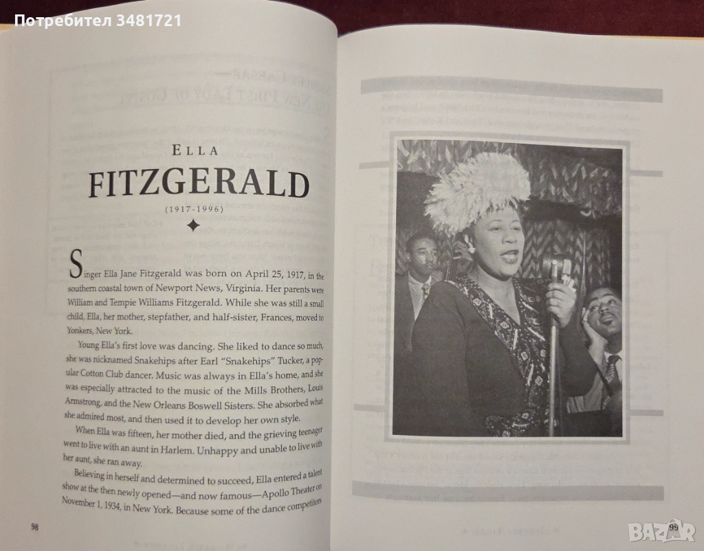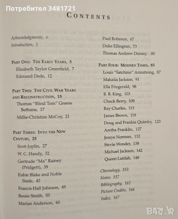 Това е историята на най-великите чернокожите музиканти на Америка, от ранните години до наши дни. Мариан Андерсън, Луис „Сачмо“ Армстронг, Чък Бери, Томас „Слепият Том“ Грийн, Бетюн, Юби, Блейк и Нобъл, Сисъл, Джеймс Браун, Рей Чарлз, Едмънд, Дийд Томас, Андрю Дорси, Дюк Елингтън, Ела Фицджералд, Арета Франклин, Елизабет Тейлър, Грийнфийлд, У. К. Ханди, Махалия Джаксън, Майкъл Джаксън, Франсис Хол Джонсън, Скот Джоплин, Б. Б. Кинг, Куин Латифа, Мили-Кристин Маккой, Джеси Норман, Гертруд „Ма“ Рейни (Приджет), Дъг и Франки Куимби, Пол Робсън, Беси Смит, Стиви Уондър. Всички те намират място в книгата, в текст и фотографии, заедно с тяхната история, музикален стил и друга любопитна информация.