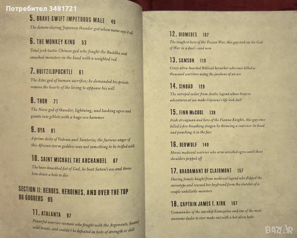 "Смъртта дойде за него в съня му, защото ако беше дошла докато е буден, тя е тази, която щеше да се бори за живота си." - това е подходящо описание за героите, за които авторът Бен Томпсън пише в книгите си. В други произведения той се фокусира върху реални личности, което донякъде ограничава ултимативния характер на историите, но не така седят нещата в настоящата книга. Нейният фокус е върху легендарни богове, бойци, митични същества и герои от цял свят, от древни времена до наши дни. Плод на необятния капацитет на съзнанието да конструира, те са крайната форма на това, което англоезичния свят нарича "badass".