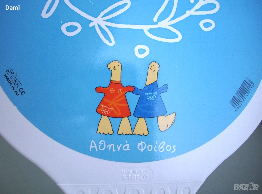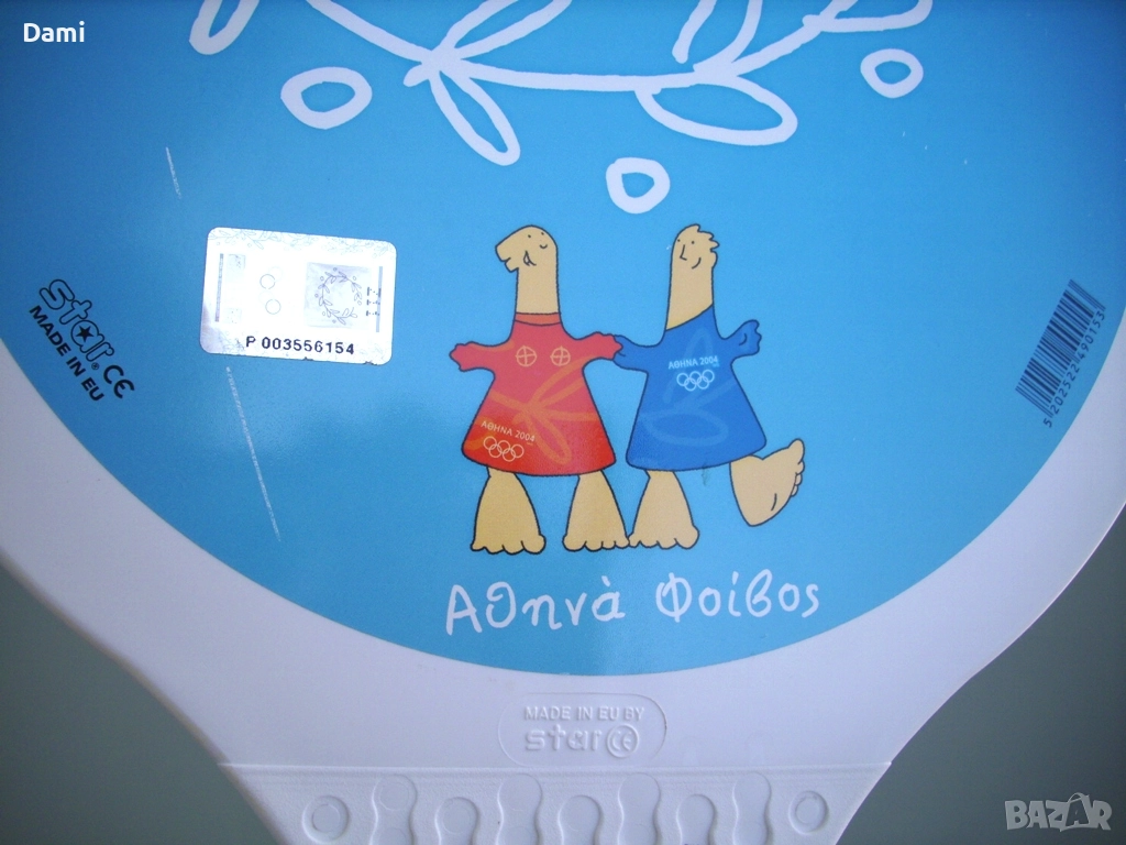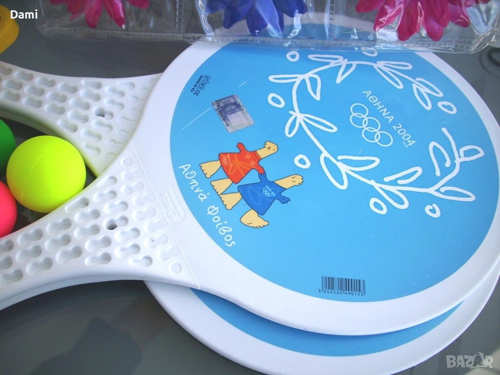 Две хилки за плажен тенис Star с три силиконови топчета, произведени в Европа с оригиналното лого на олимпийските игри в Атина. Дължина 37 см, диаметър 22 см, диаметър на топчетата 4,5 см. Маркирани с холограмен стикер. Подходящи за деца над 10 год. и възрастни. Нови, неупотребявани.