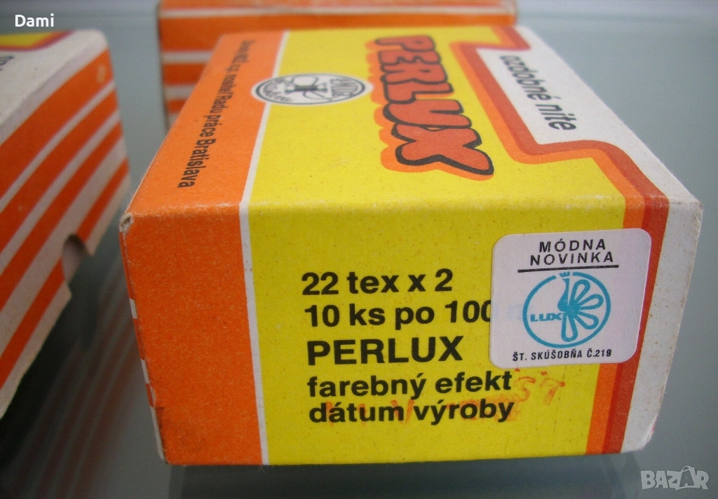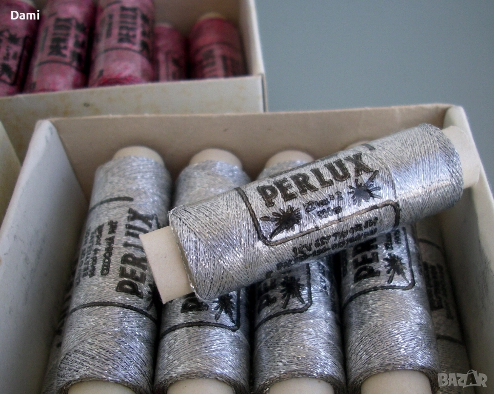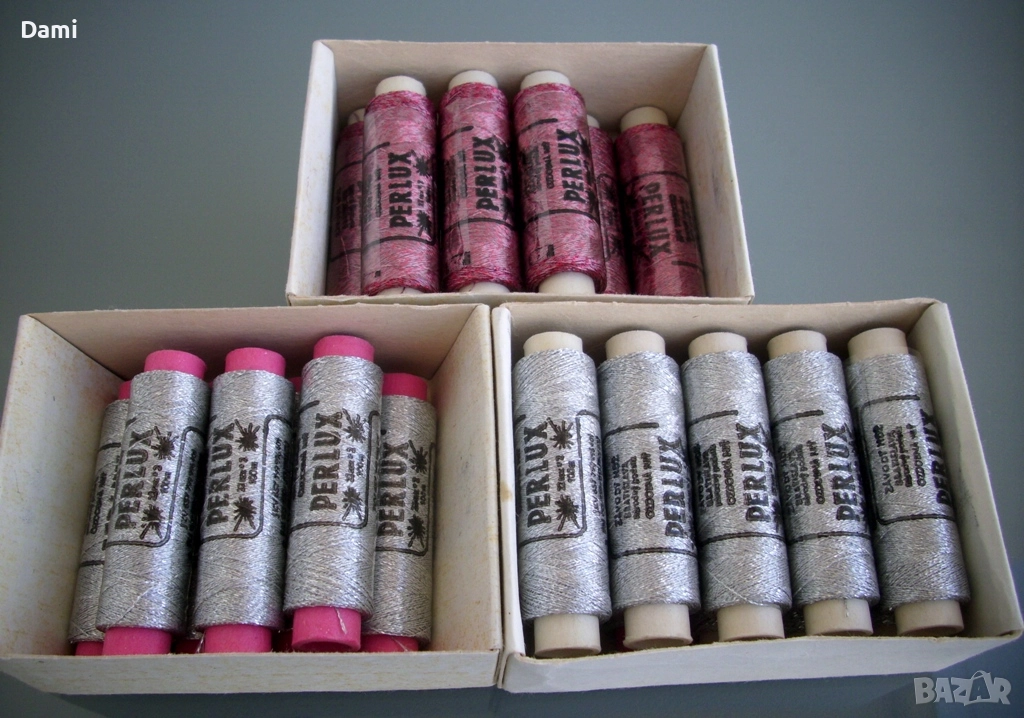 Метализирани конци тип ламе Perlux, 22tex х 2, 100 м/бр., висококачествено чехословашко производство. Цена 2.56 €/бр. Цветове: сребро 18 бр., червен меланж 8 бр., зелен меланж 3 бр.