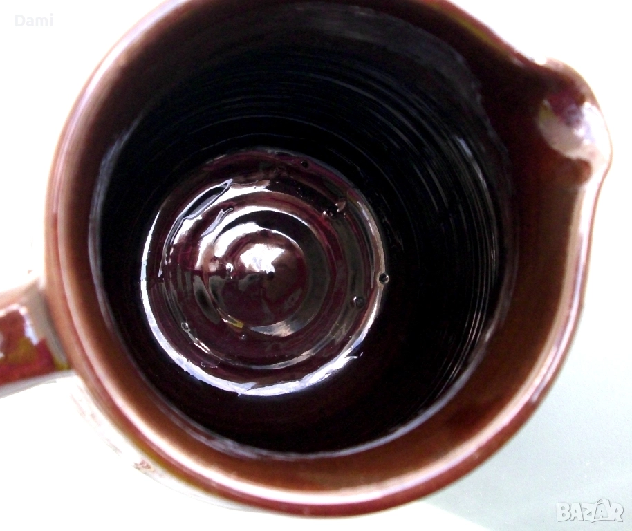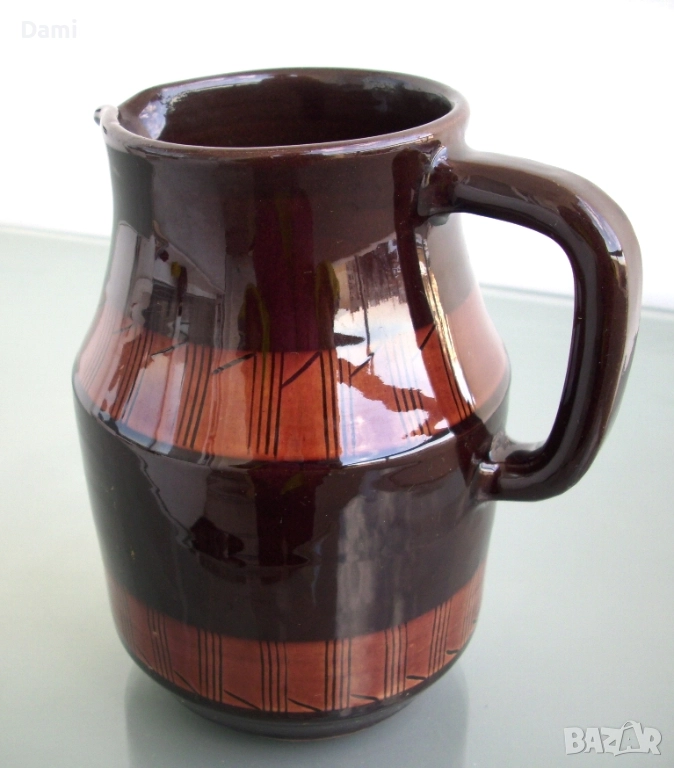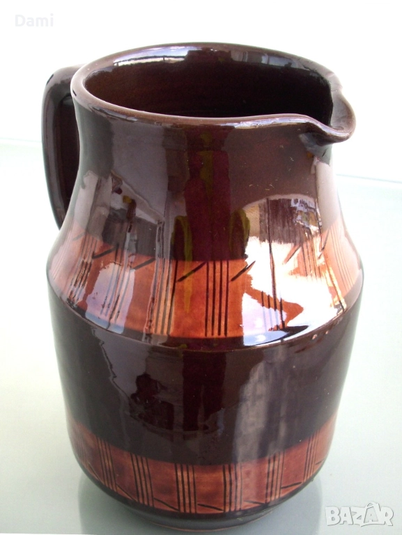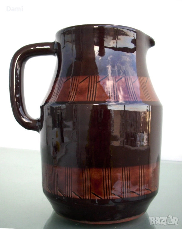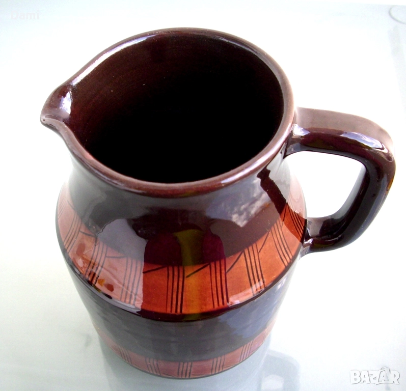 Кана за вода, вино, българска керамика, с декоративен мотив "черга". Ранно соц.производство. Неупотребявана. Здрава, добре изпечена, стои стабилно, с удобна дръжка. Отлична глазура, без забележки. Височина 17 см, вместимост 1000 мл.