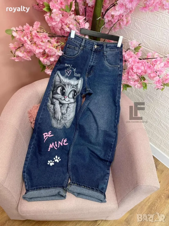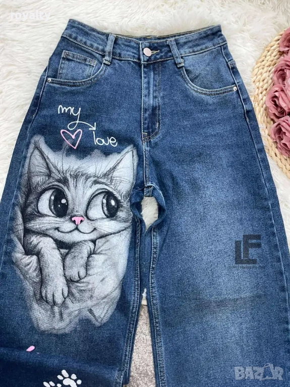 Кройка: Кройката е с прави, широки крачоли, издължаваща, средна към висока талия, ръчно рисувни