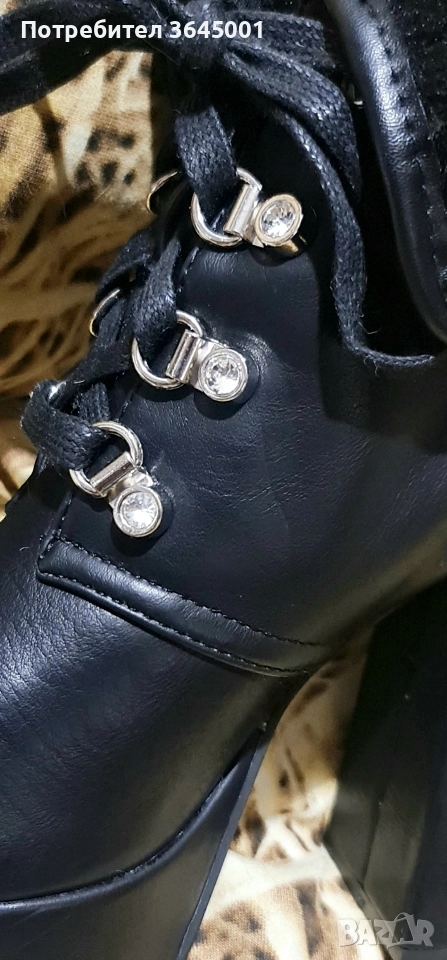 Дамски стабилни черни боти от качествена изкуствена кожа, с масивен ток и платформа.С връзки и декоративни метални елементи с бляскави камъчета ,тип кристали. С обърната пухкава " яка ", много топлещи и стабилни, подходящи за студените зимни дни . N36 / НОВИ