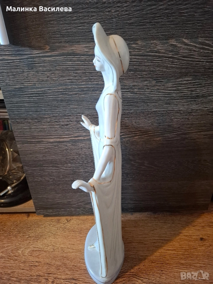 Изящна порцеланова фигура на дама, с фини златисти акценти и елегантна форма. Височина – 48 см. Подходяща за декорация, колекция или подарък. Без забележки, в отлично състояние.