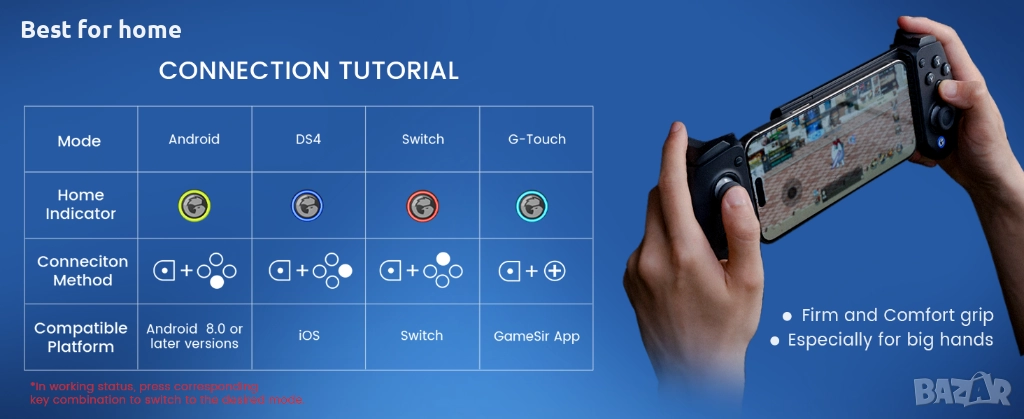 🎮 Връзка: Bluetooth за мобилни устройства, кабелна за компютър. Капацитетът на батерията от всяка страна е 500mAh.