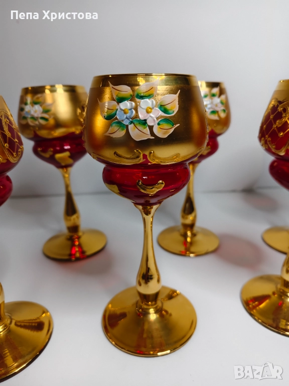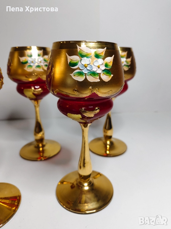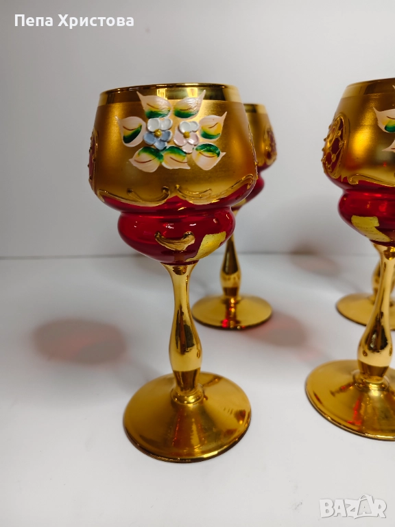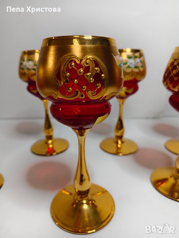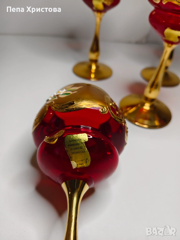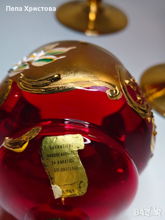 чаши за вино от италиански цветен кристал в рубинен цвят, 24К позлата, ръчно изрисувани релефни флорални елементи. - Италия.
