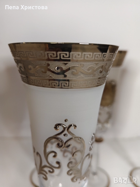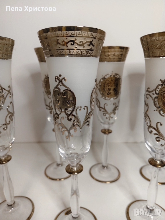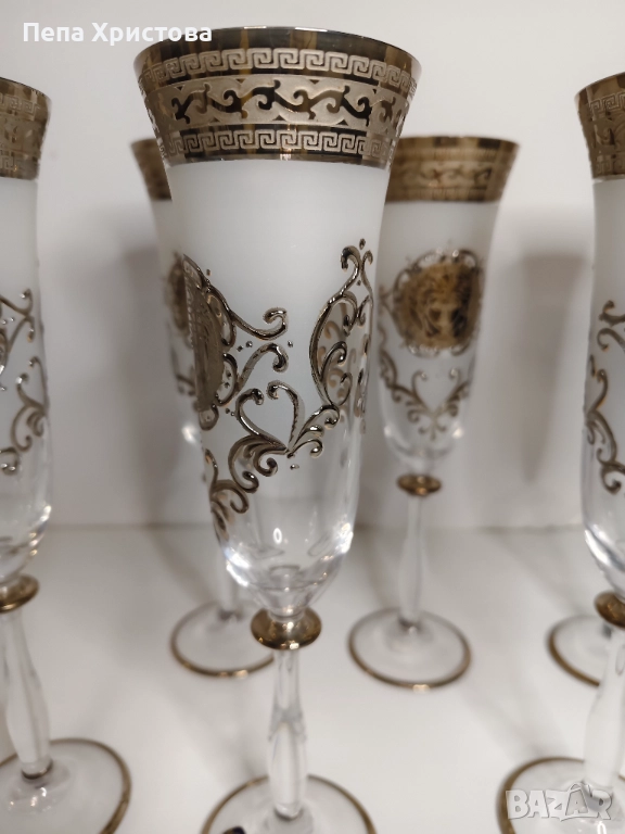 Комплект от 6 броя чаши за шампанско от чешки кристал Бохемия. Основният декор е сребрист кант с меандър, често срещан в древногръцкото и римско изкуство и разбира се, Медуза. Всичко това е с нежна ръчно изрисувана "рамка".
