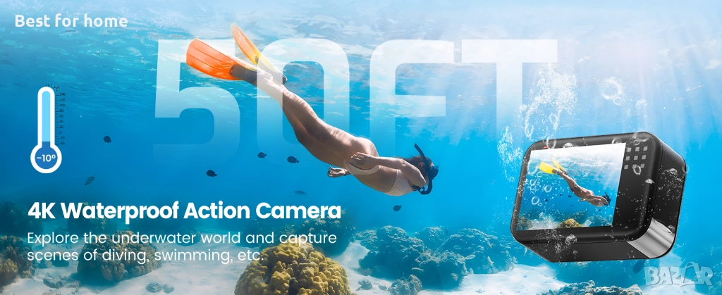 Водоустойчива камера под вода: Проектирана с издръжлива водоустойчивост IP68, подводната камера се гмурка без усилие до 15 м (50 фута) с дълготрайна водоустойчивост. Не е необходим калъф, подобрява яснотата на звука и предотвратява замъгляването в студени или влажни условия, осигурявайки ясни кадри. Насладете се на безпроблемно управление с бързо реагиращ сензорен екран и бутони. Подходяща за снимане във вода или мокра среда, като плуване, гмуркане, сърф, рафтинг, ски и спорт в дъжда, за да можете напълно да се потопите в приключението без притеснения.
