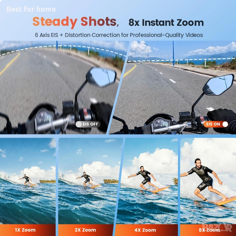 Ултрастабилен запис: Вградената усъвършенствана 6-осна жироскопска електронна стабилизационна система (EIS) осигурява плавен и стабилен видеозапис дори по време на интензивно действие. Независимо дали се състезавате по планински велосипедни пътеки, карате вълни или пътувате по заснежени склонове, тази видеокамера ефективно елиминира трептенето и изкривяванията, предоставяйки плавни 4K кадри, които улавят всеки вълнуващ момент.