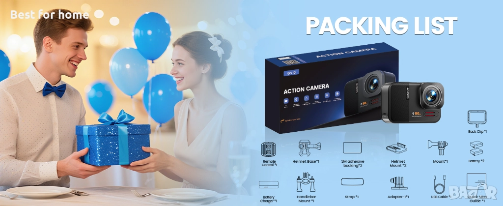 Внимателно обслужване и комплект: Тази 4K екшън камера се предлага с 64GB карта памет, две батерии 1350mAh, многофункционално зарядно устройство за батерии, безжично дистанционно управление и множество стойки (за велосипед, каска, сърф и др.)
