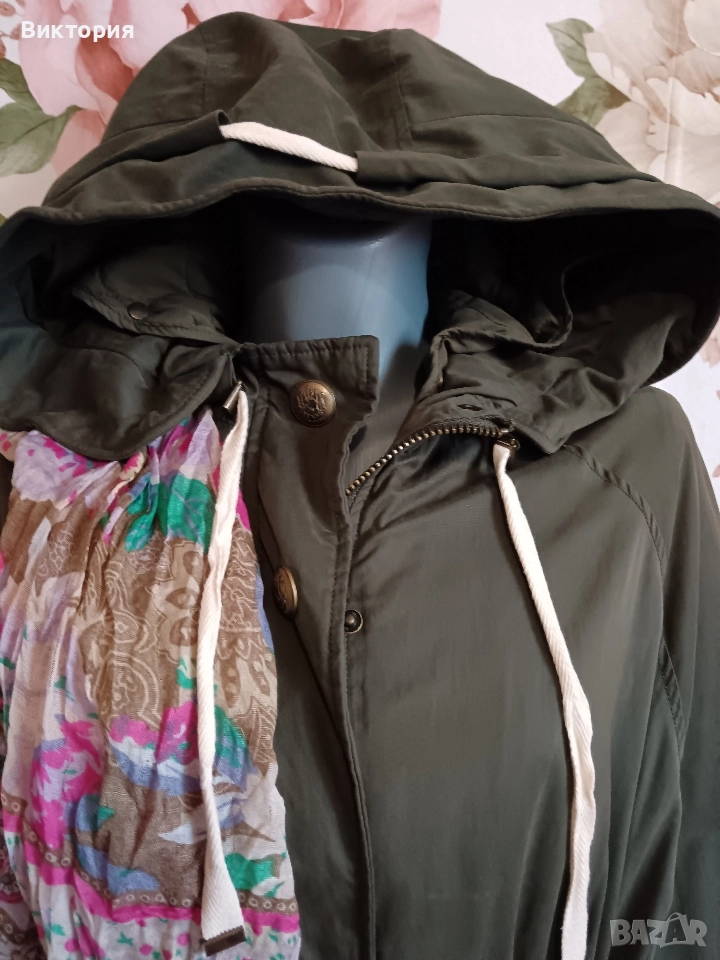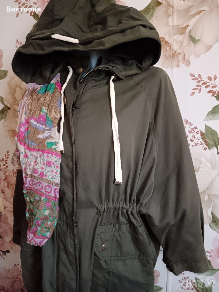 Дамско яке на zara, със свалящ се подплата огромна качулка регулираща талия с връзки в кръста от вътрешната и външна страна ,свободен модел с ръкав тип прилеп и дължина 3/4,размер с-м ,подходящ за бременни ,цена 30лв