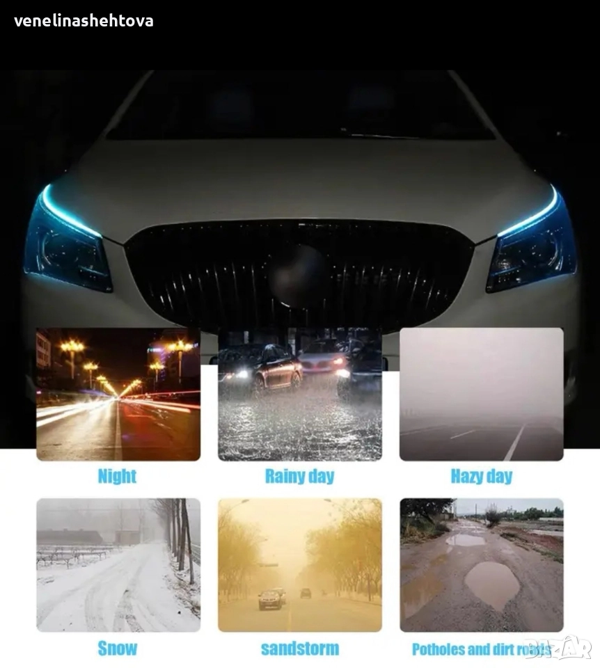 Така повече няма да забравите да включите светлините. При работещ двигател свети ярка студено бяла светлина(6000K), а при включване на мигача превключва плавно и мига в жълто