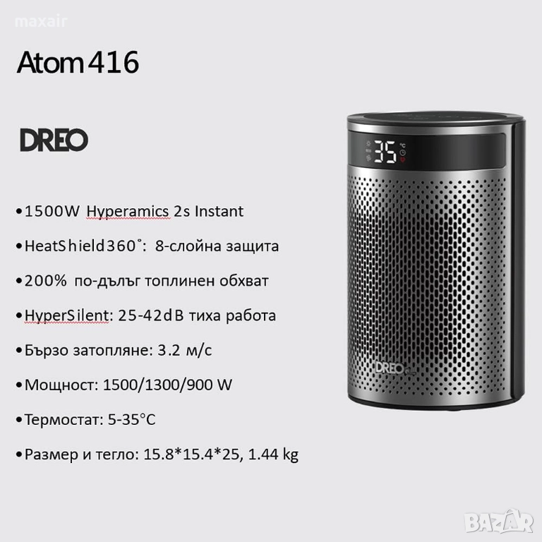 Преносимият отоплителен уред DREO Atom 416 разполага с дистанционно управление, керамичен електрически нагревател с термостат с 2-степенна прецизност, позволяващ настройки на температурата от 5 до 35°C за енергийно ефективен комфорт, 12-часов таймер.