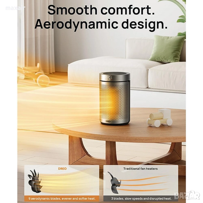 Отоплителите DREO носят едновременно спокойствие и топлина. Работата без триене и дизайнът на вентилатора намаляват турбуленцията и понижават шума до само 25 dB.