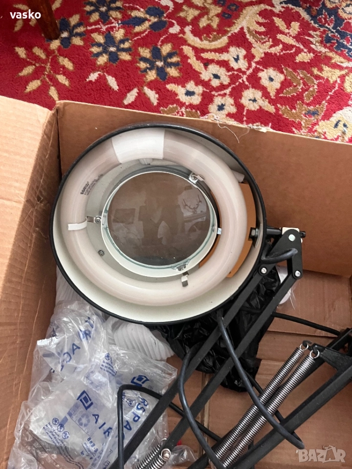 Лупа с осветление на метална стойка,стационарна,нова,още не е сглобена.
