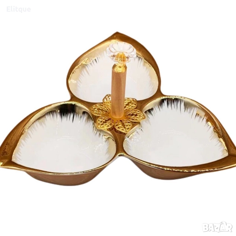 Луксозна порцеланова купа в бяло и златисто, с три гнезда за ядки. ✨ Опулентна порцеланова купа в бяло и златисто с три уютни гнезда за ядки! ?? Добавете елегантност и практичност във вашите сервировки с този изискан акцент. ?✨
