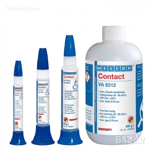 цена 30 гр 23 лв цена 500 гр 270 лв Weicon VA 8312 е цианакрилатно секундно лепило за гума и пластмаса. То е с нисък вискозитет (20-40 mPa/s) и се втвърдява много бързо. Подходящo е за свързване на разнообразни гумени материали като твърд каучук, пластмаси и EDPM еластомери. Лепи празнини до 0.1 мм. Крайна якост след придобева приблизително след 24 ч.