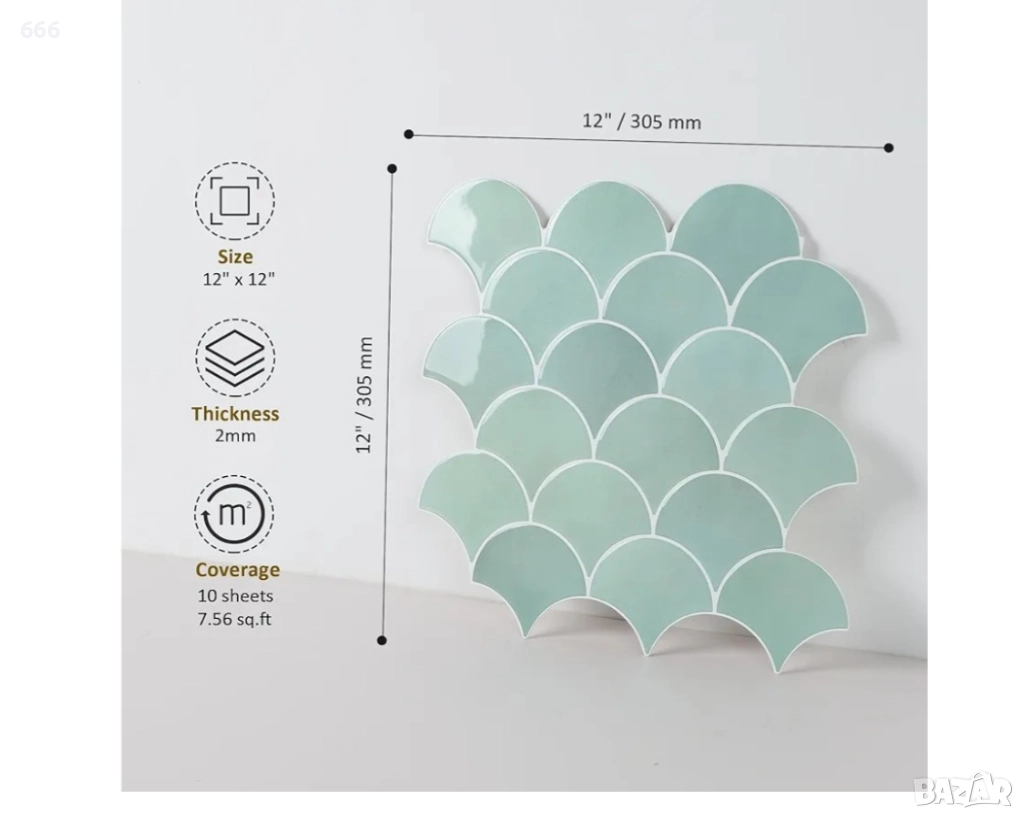 Размер и покритие: 10 листа зелени плочки с рибена люспа, всяка плочка е с размери 12x12 инча, покрива около 7,56 кв. фута. Дебелина 2-2,2 мм, което е много по-дебело от обикновените винилови плочки.
