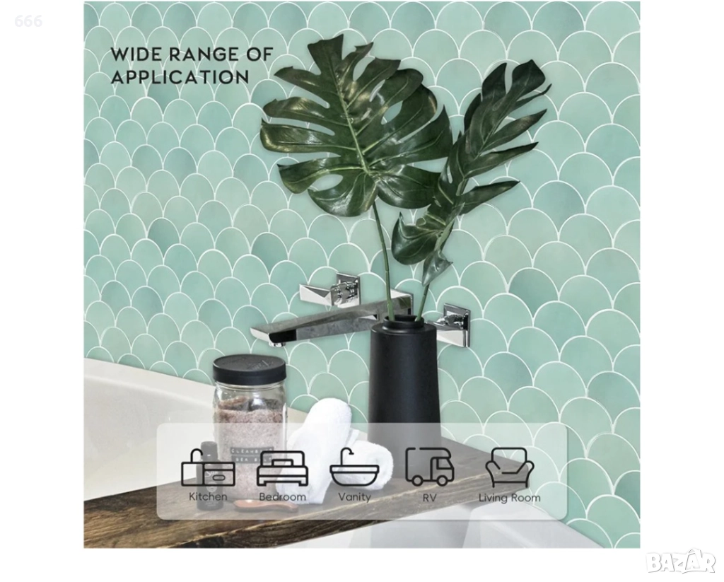 Широка употреба: Самозалепващите се стенни плочки могат да добавят нотка елегантност и изтънченост към всяко интериорно пространство. Широко използвани за кухня, баня, перални, кемпери и др. Могат да се поставят върху всякакви гладки и чисти повърхности като стъкло, тапети, керамика, метал и др.