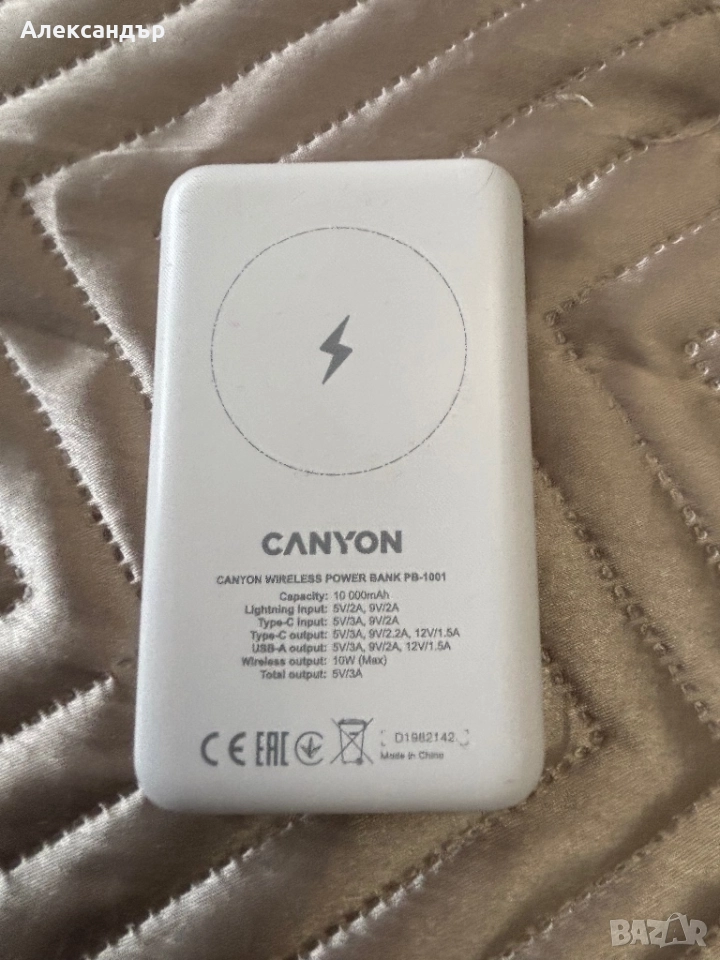 Здравейте, продавам външна батерия модел Canyon PB-1001. Батерията е с капацитет от 10 000mAh. Използвана е, но работи добре, всички портове са изрядни и има безжично зареждане.